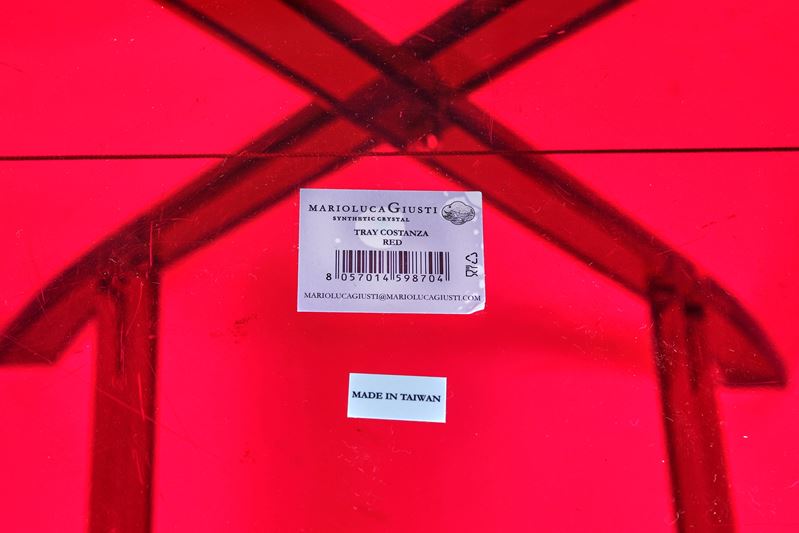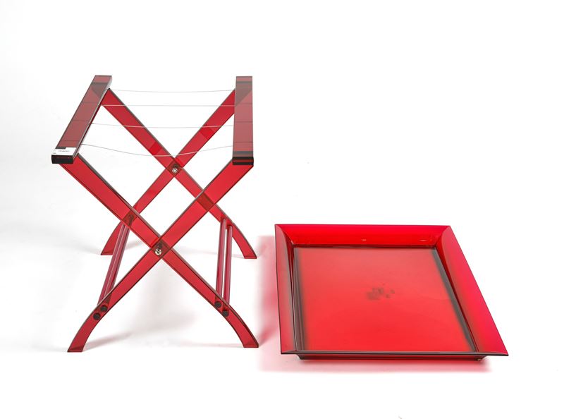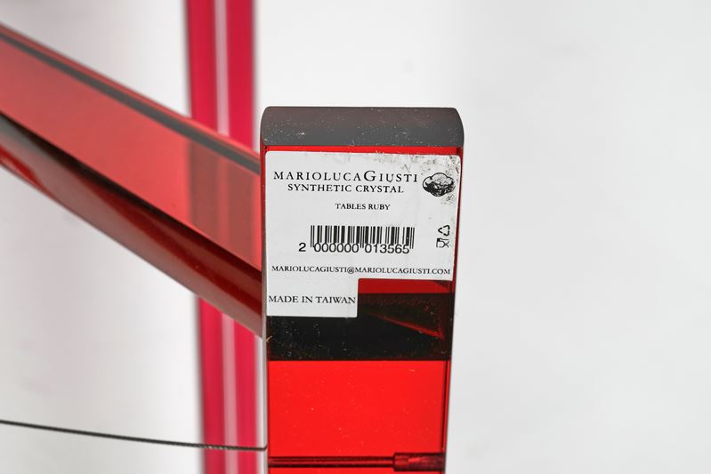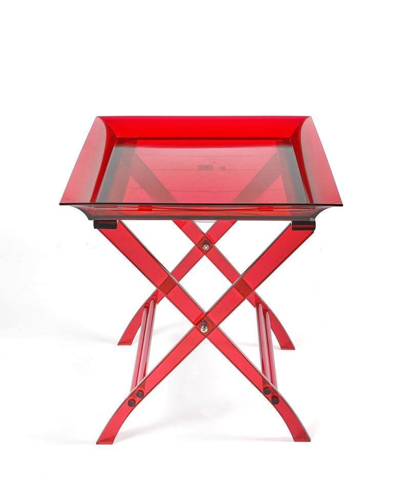 MARIO LUCA GIUSTI (Firenze 1956) Tavolino modello Next con vassoio modello Costanza. In cristallo sintetico rosso. XXI secolo. Cm totali 53x63x49. Recano etichette del marchio.