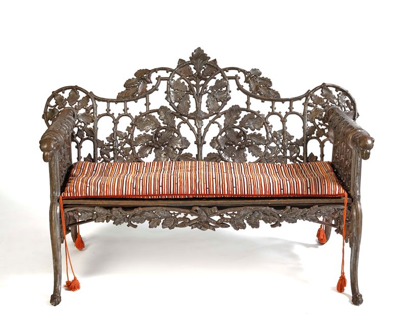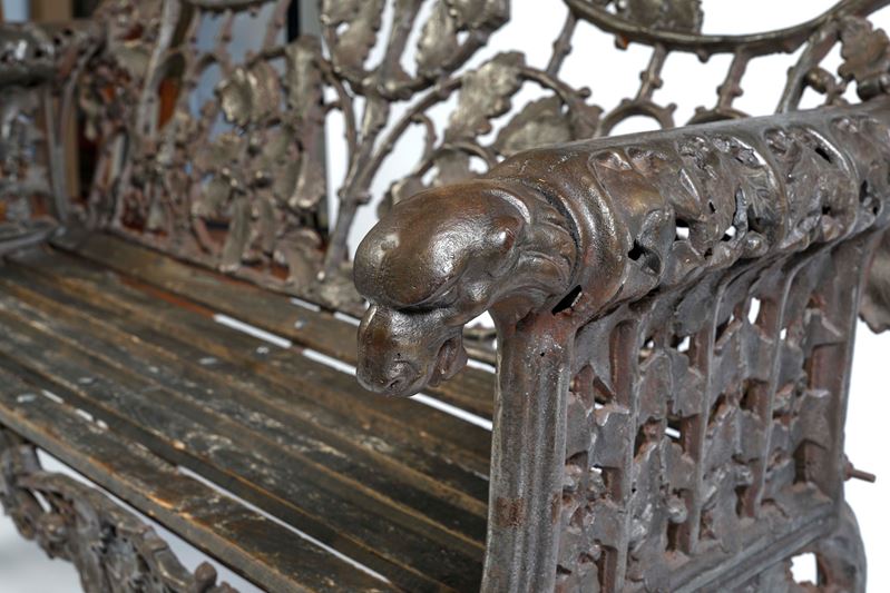 Panchina da giardino Liberty in ghisa lavorata a motivi floreali. Cm 96x145x80.