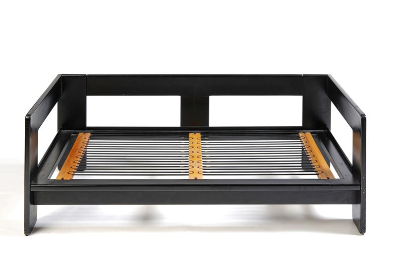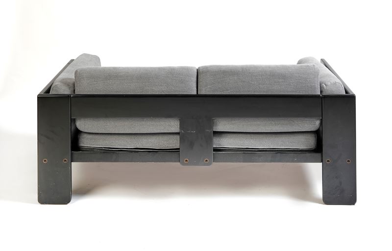 AFRA & TOBIA SCARPA Divano modello Bastiano in legno laccato nero e cuscini in tessuto grigio. 1962. Cm 67x150x75. Prod. Gavina, Italia.
