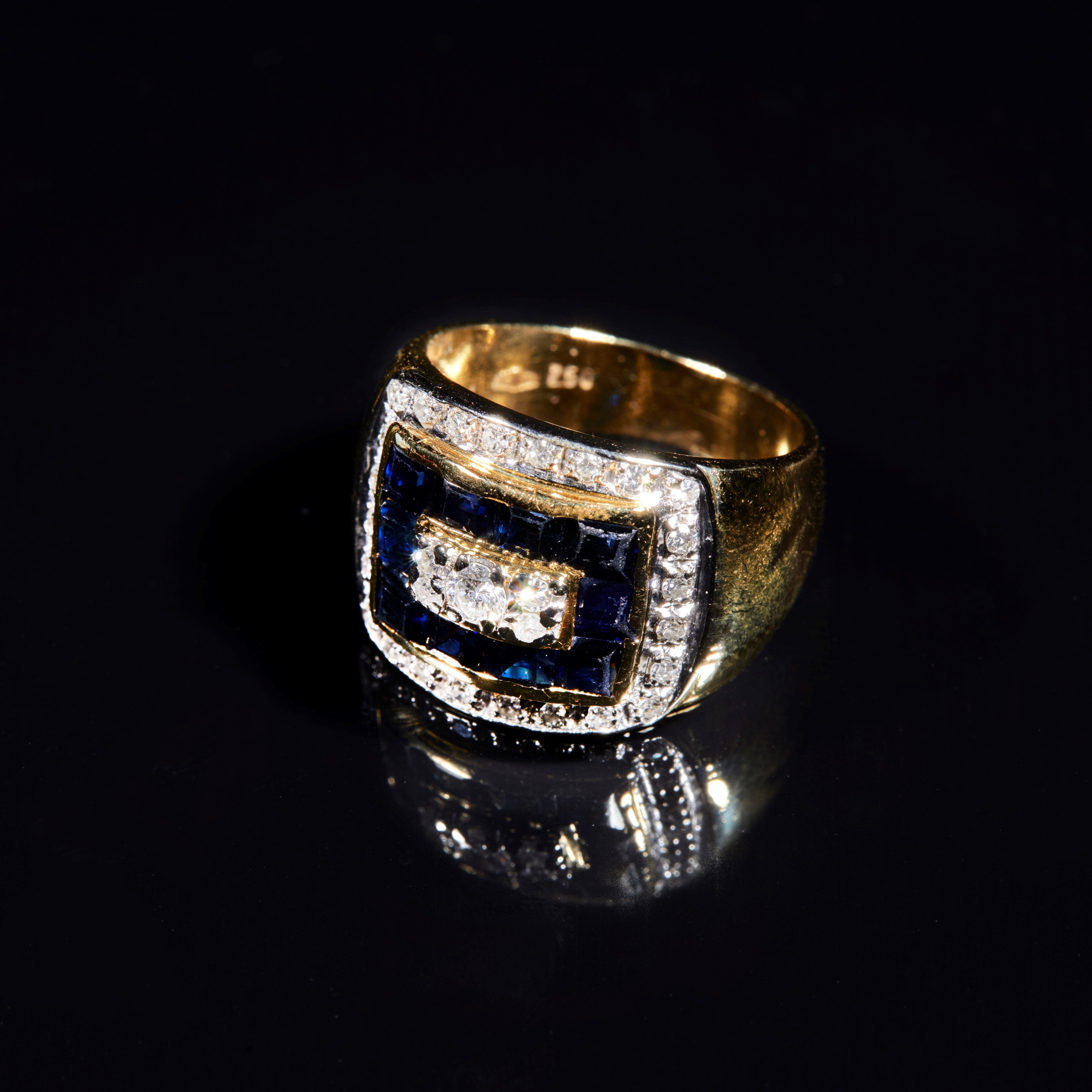 Anello a fascia in oro giallo, sommità decorata con motivo geometrico in zaffiri carré e piccoli diamanti. Punzone “750”. Peso complessivo 9,1 grammi.