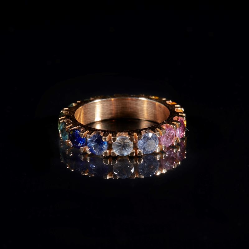 Anello in oro rosa, realizzato come una fede girodito di zaffiri multicolori "Rainbow" rotondi sfaccettati per una caratura stimata di 4.70 ct. Punzone "750". Peso complessivo 7 grammi.
