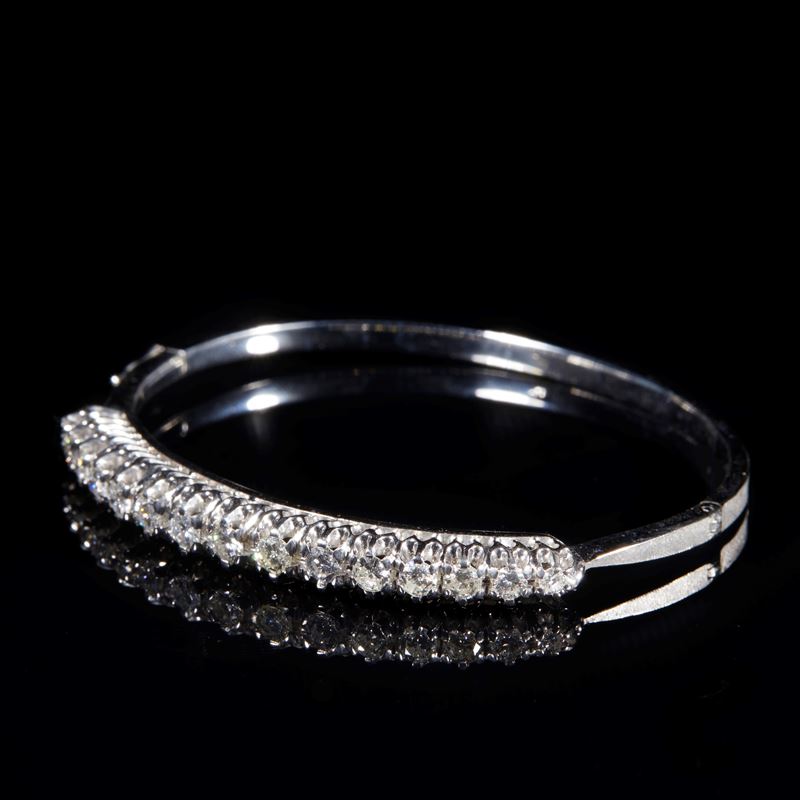 Bracciale rigido in oro bianco decorato sommitalmente ad una fila di diamanti taglio brillante per una caratura stimata di 2.2 ct circa. Punzone "750". Peso complessivo 22,7 grammi.