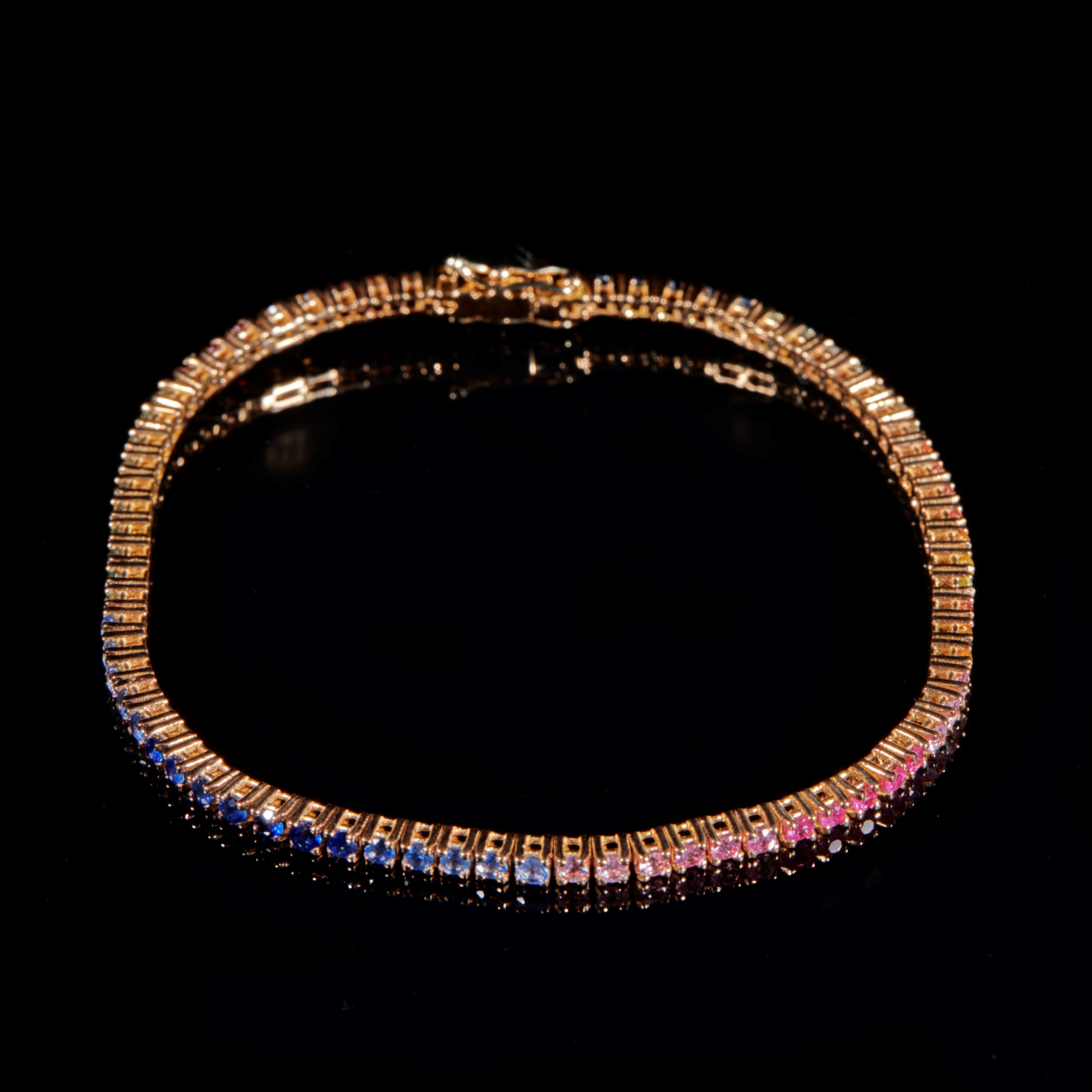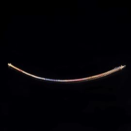 Bracciale tennis in oro rosa, realizzato ad una fila di zaffiri multicolori (Rainbow) di taglio a brillante rotondo per una caratura stimata di 3.40 ct. Punzone "750". Peso complessivo 9,2 grammi.