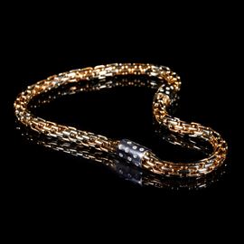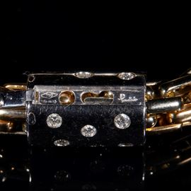 Collana in oro Pomellato, realizzata a foggia tubolare con maglie allungate in oro bianco e rosa disposte in sezione circolare, con elemento decorativo e chiusura lumeggiate in brillanti (peso stimato 1.30 ct circa). Punzoni "750" e "Pomellato". Lunghezza 42 cm. Peso complessivo 151,3 grammi.