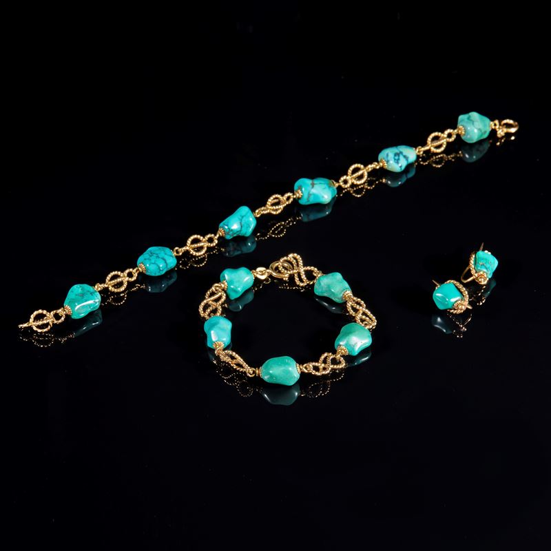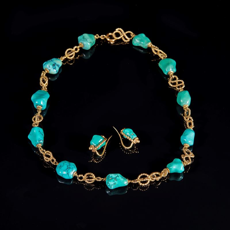 Demiparure in oro giallo e turchesi, costituita da collana e orecchini con lavorazione a cordonetto. Punzone "750". Peso complessivo 33,2 grammi.