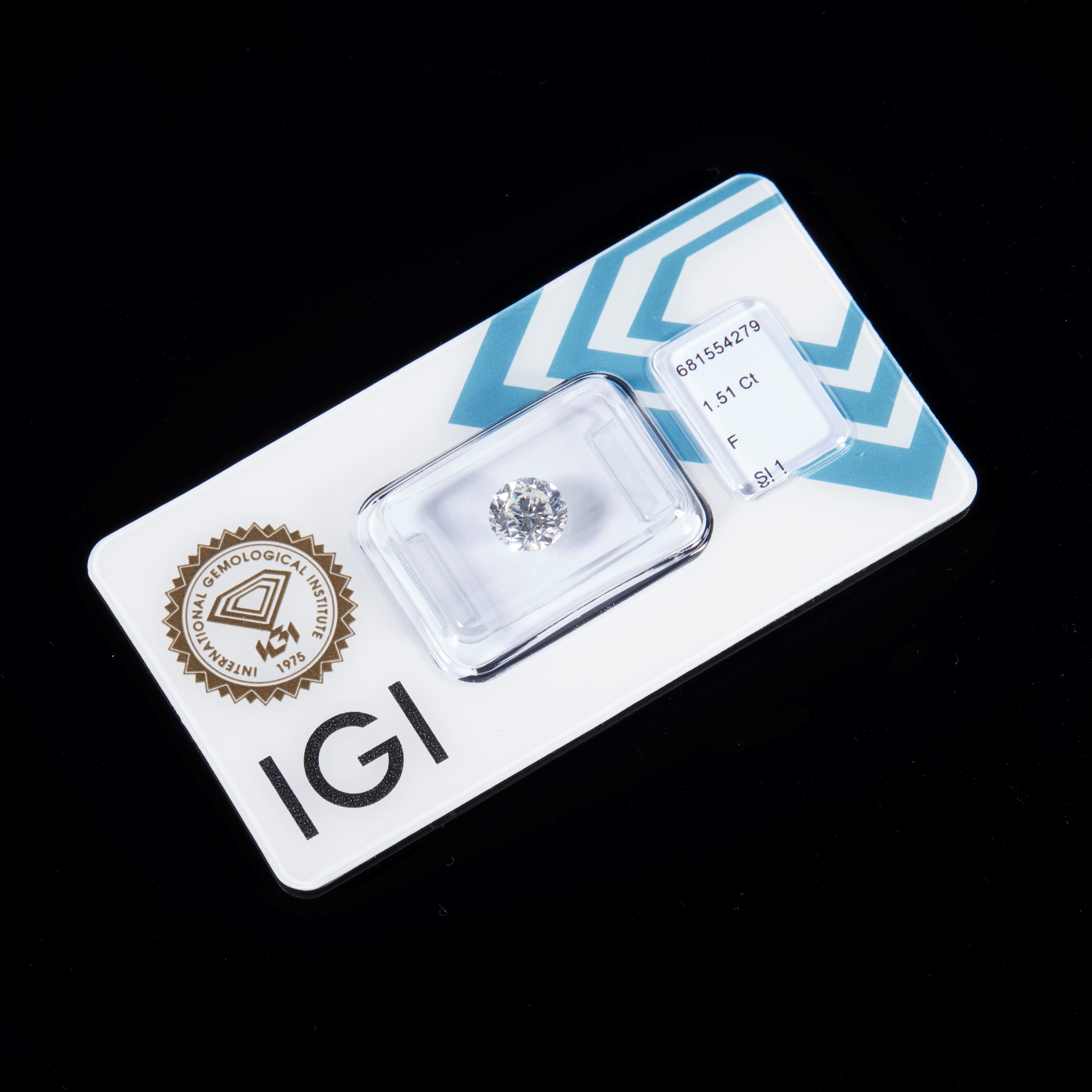 Diamante in blister. Taglio brillante, ct 1.51, colore F, purezza SI1. Corredato di certificato IGI Anversa che ne attesta le caratteristiche.