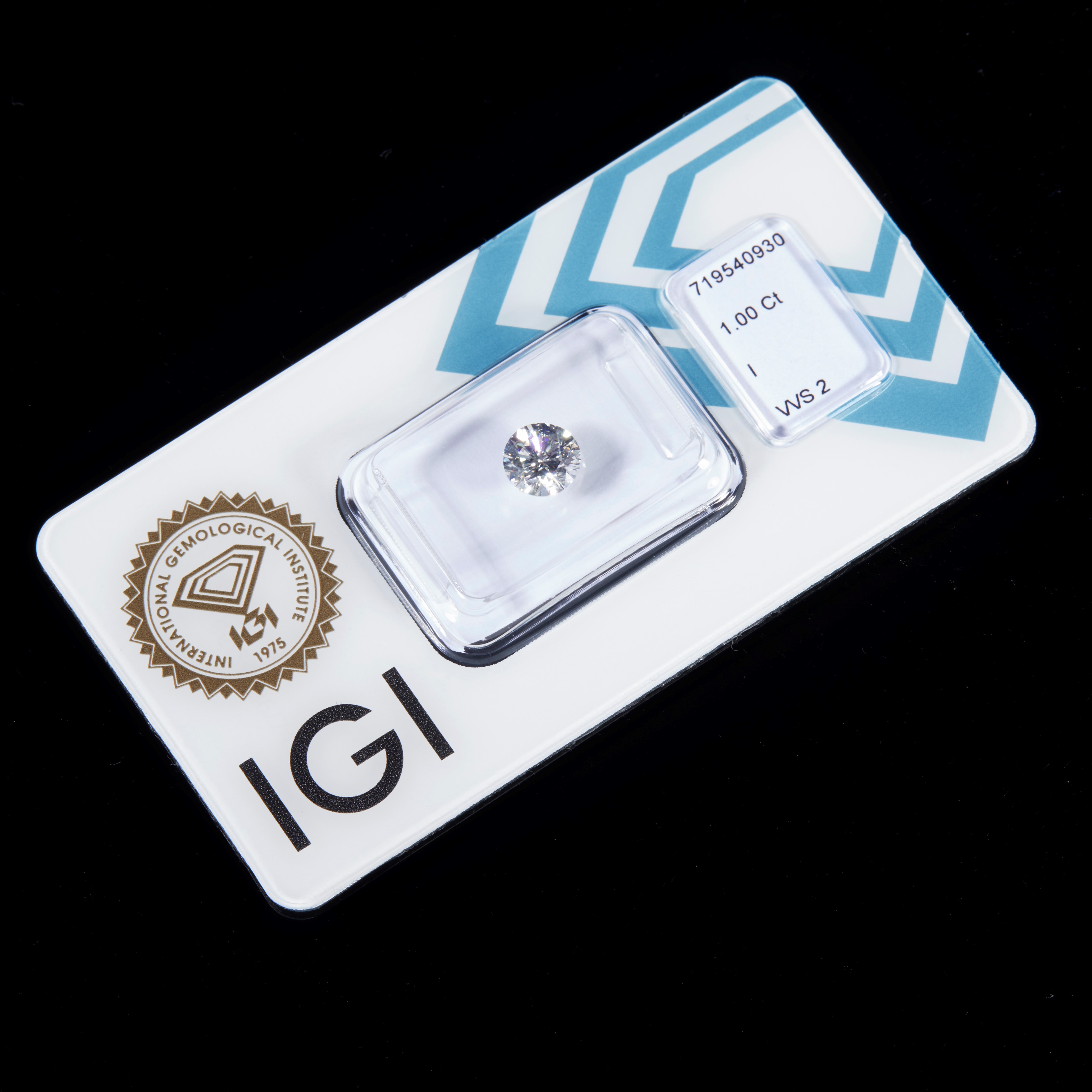 Diamante in blister. Taglio brillante, ct 1.00, colore I, purezza VVS2. Corredato di certificato IGI Anversa che ne attesta le caratteristiche.