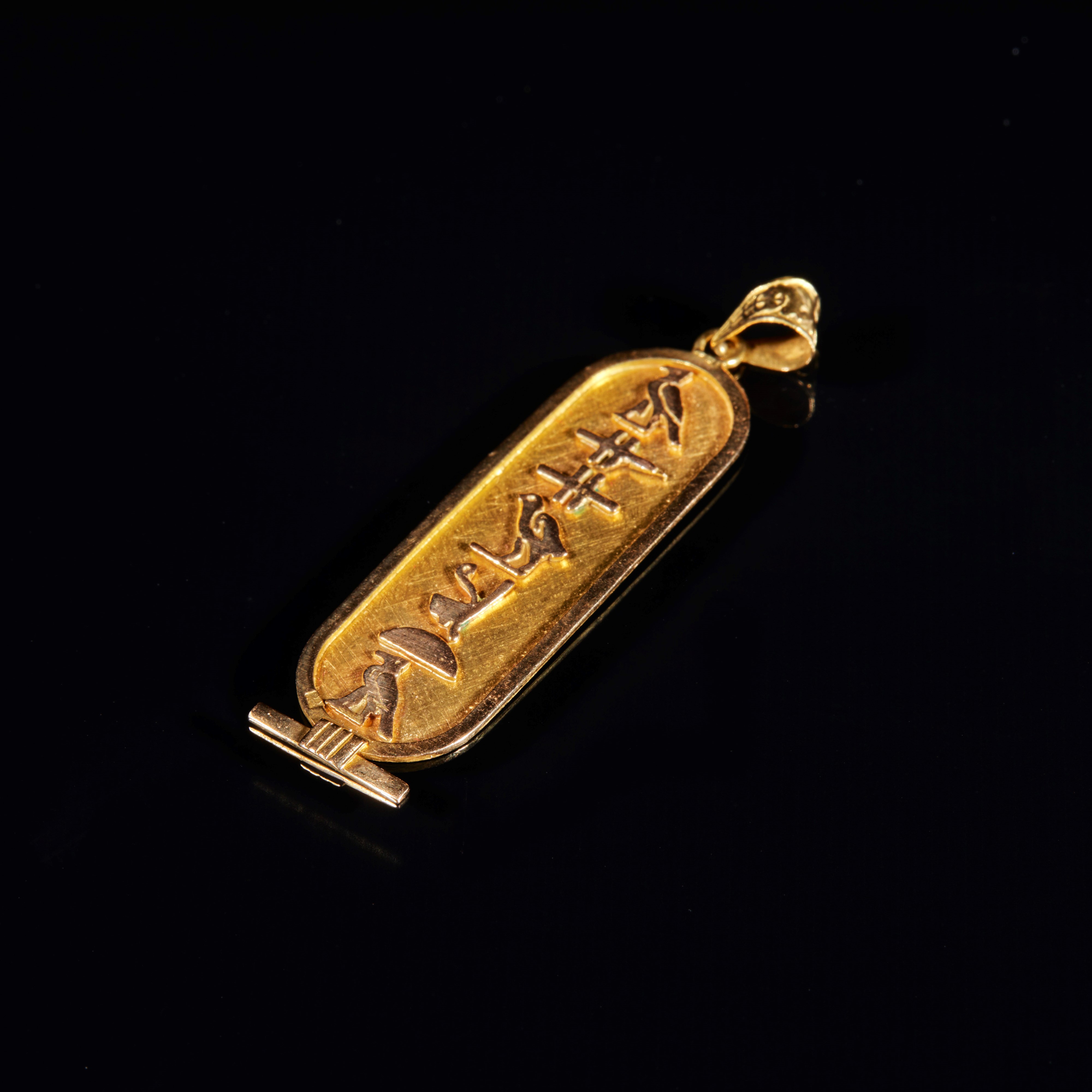 Pendente in oro giallo raffigurante ideogrammi egizi. Peso complessivo 2,6 grammi.
