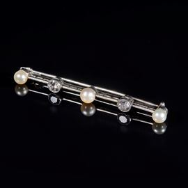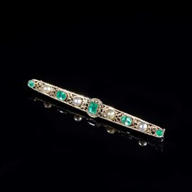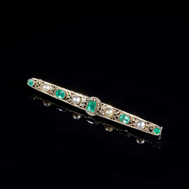 Spilla in oro bianco, realizzata come una barretta allungata, traforata e incisa, decorata ad alternanza di smeraldi e perle. Peso complessivo 6,2 grammi.