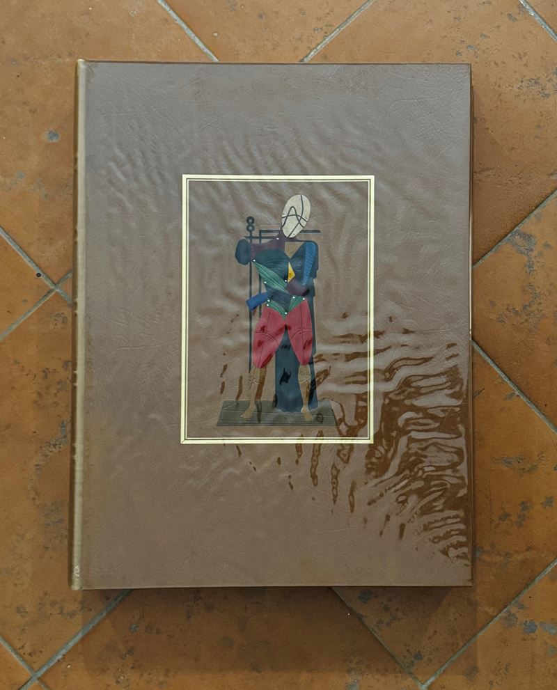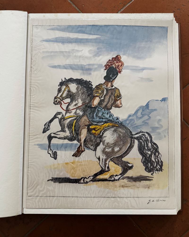 S. Quasimodo, "Giorgio de Chirico", Napoli, Ed. Marotta, 1968. Saggio inedito di Salvatore Quasimodo e n° 41 riproduzioni litografiche di opere di De Chirico. La prima tavola riproduce un disegno dal titolo "Il cavaliere solitario" che De Chirico ha appositamente realizzato per quest'opera ed è firmata in grafite dall'autore. Copia numerata 375/600, edizione italiana (entro custodia).