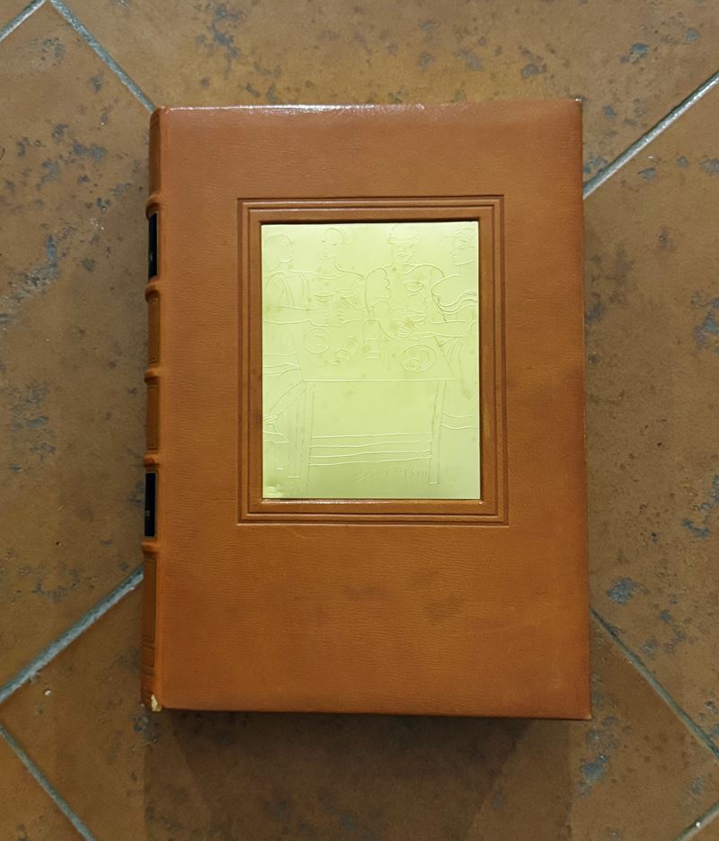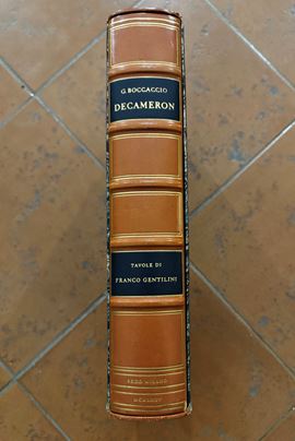 G. Boccaccio, “Il Decameron”, Milano, Ed. Sedd, 1975. Con tavole di Franco Gentilini. Esemplare n. 157 su 500 copie, con lamina d’oro incisa e firmata posta al centro del piatto anteriore, contornata da cornice a doppio filetto impressa a secco (volume conservato entro custodia in cartone marmorizzato).