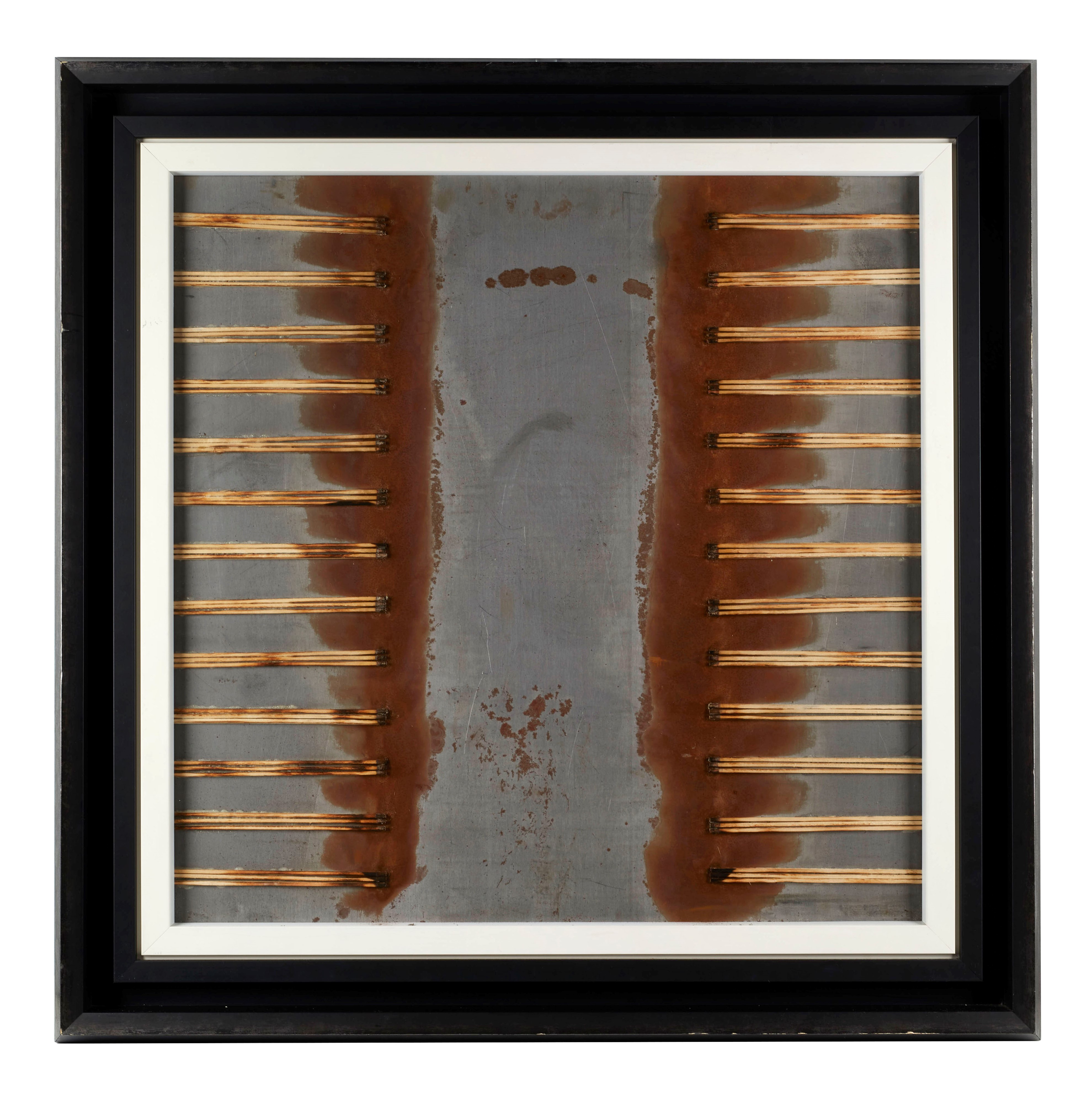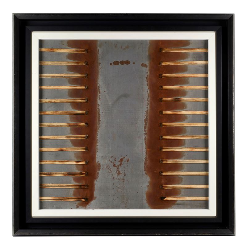BERNARD AUBERTIN (Fontenay-aux-Roses 1934 - Reutlingen 2015) "Fiammiferi bruciati su alluminio", 2009. Fiammiferi bruciati su alluminio. Cm 70x70. Opera firmata e datata in basso a destra Bernard Aubertin 2009. Al retro reca probabile numero di archivio.