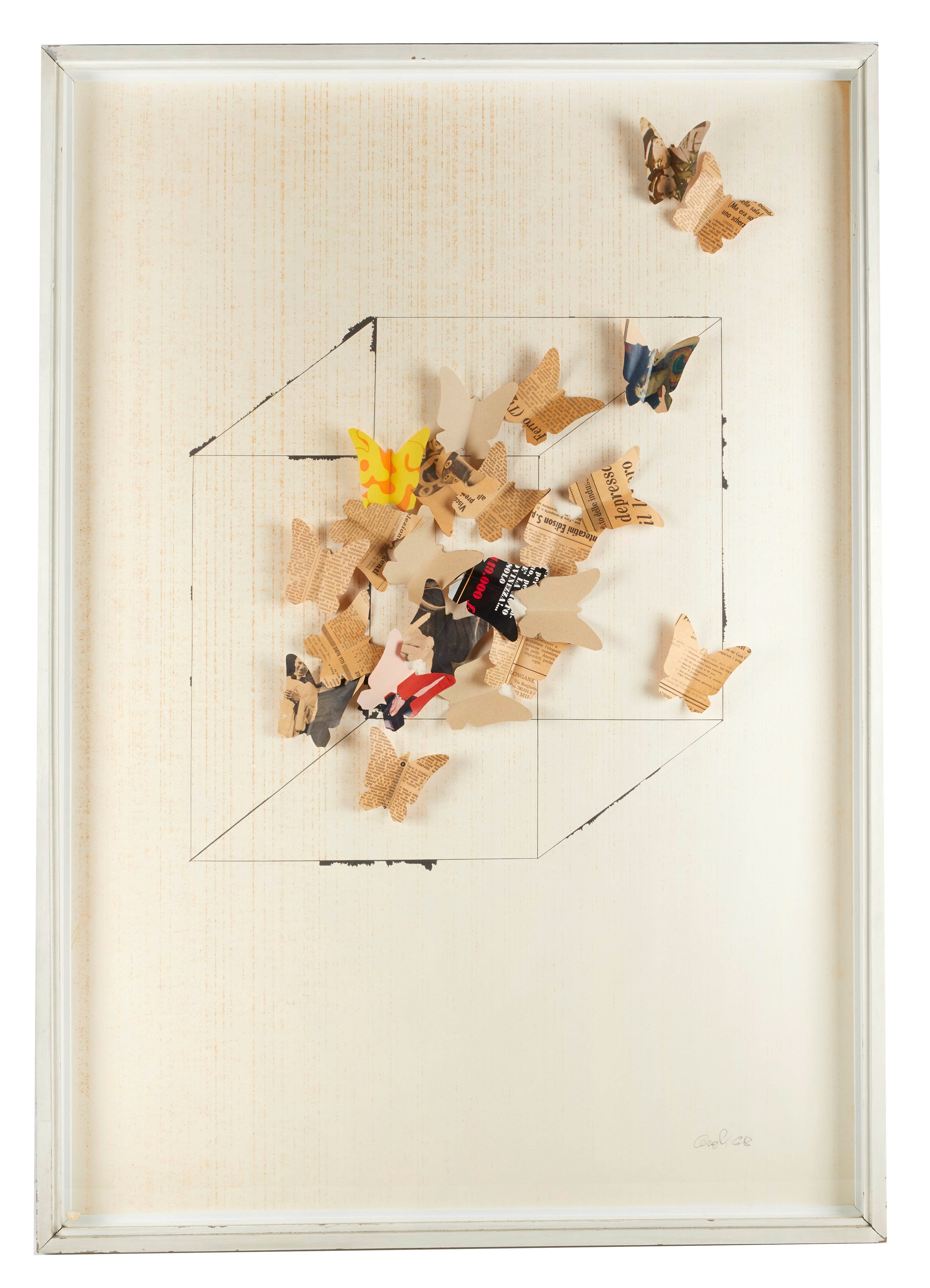 MARIO CEROLI (Castel Frentano, 17 maggio 1938) "Le farfalle nella scatola", 1968. Cm 70x100. Collage su base litografica. Opera firmata e datata in basso a destra Ceroli 68.