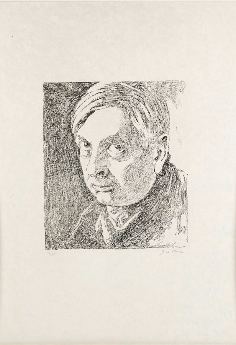 GIORGIO DE CHIRICO (Volos 1888 – Roma 1978) “Autoritratto”, 1972. Litografia a colori su carta japon. Cm 77x57. Opera firmata in basso a destra G. de Chirico. Reca numeri di tiratura in basso a sinistra 56/95. Reca timbro a secco di Alberto Caprini Stampatore Roma in basso a destra. Reca timbro a secco Giorgio de Chirico in basso a sinistra.
