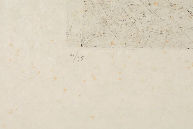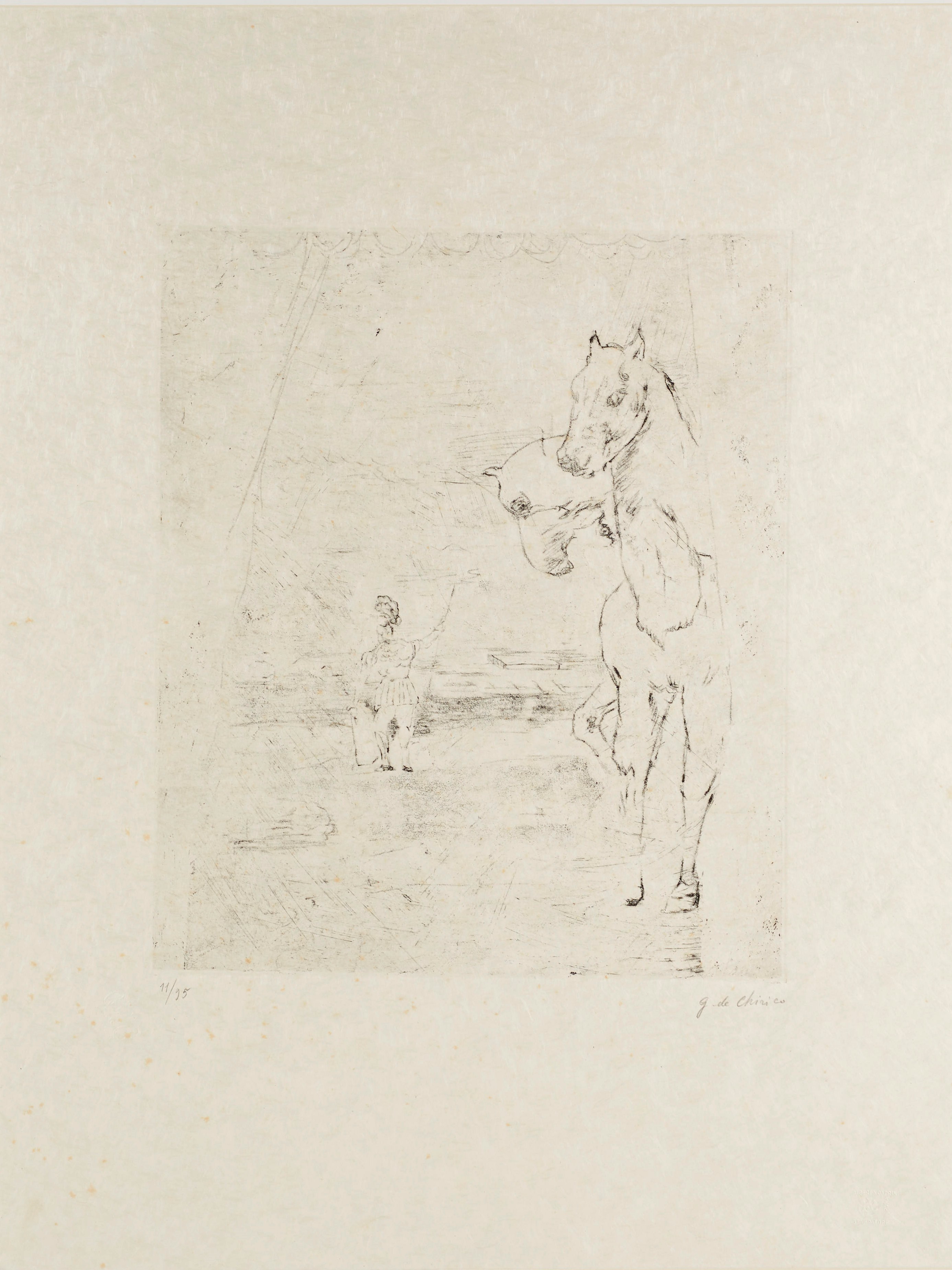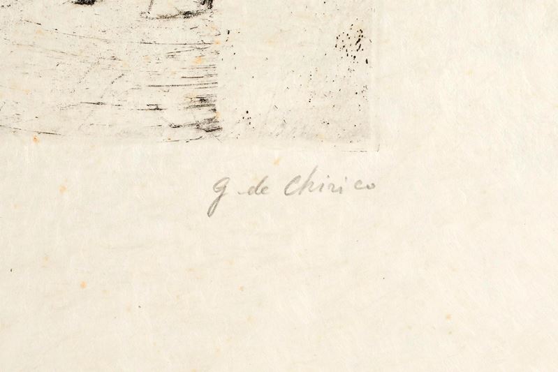GIORGIO DE CHIRICO (Volos 1888 – Roma 1978) “Il ritorno del guerriero”, 1972. Incisione a vernice molle su carta japon. Cm 65x50. Opera firmata in basso a destra G. de Chirico. Reca numeri di tiratura in basso a sinistra 11/95. Reca timbro a secco di Alberto Caprini Stampatore Roma in basso a destra. Reca timbro a secco Giorgio de Chirico in basso a sinistra.