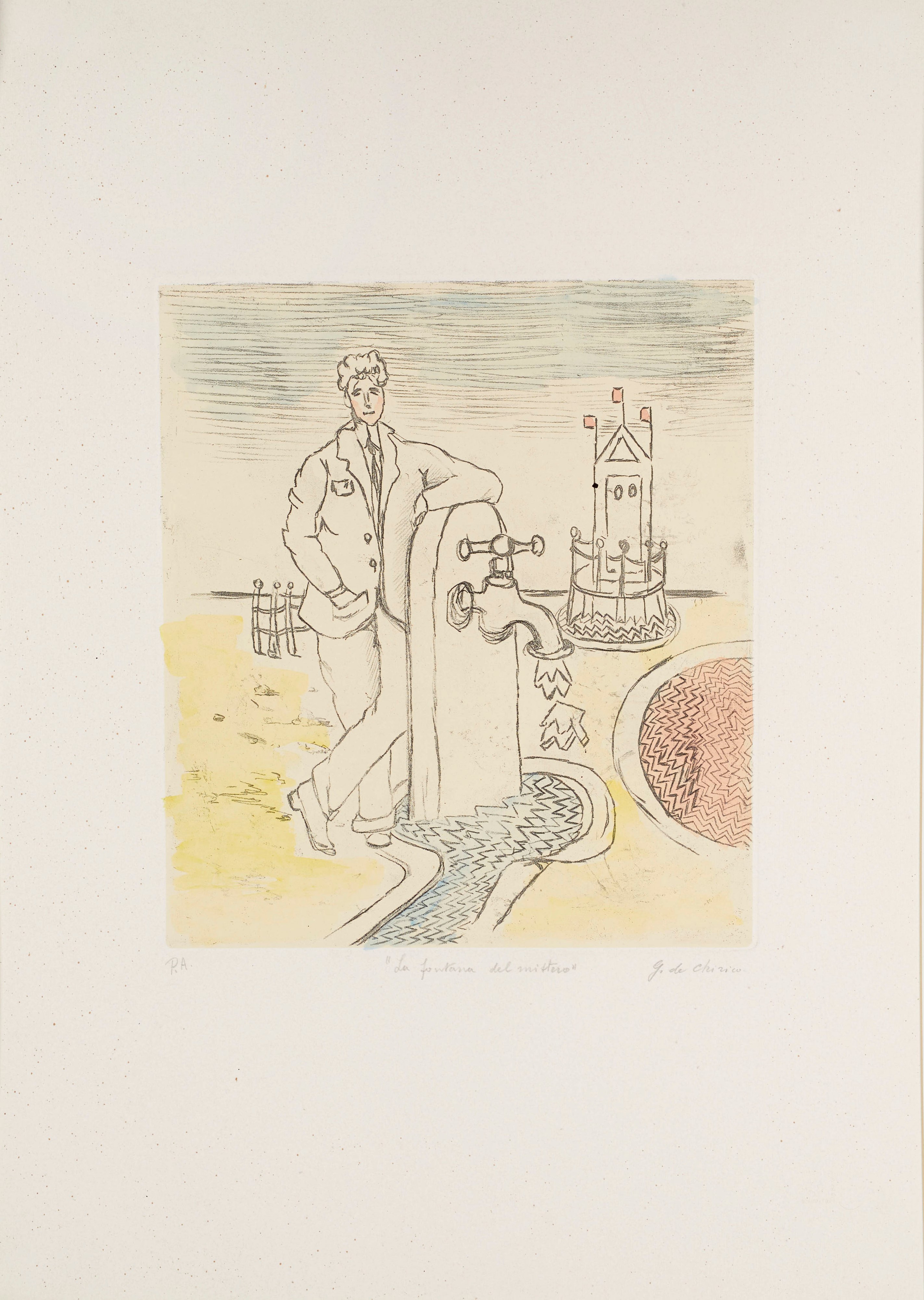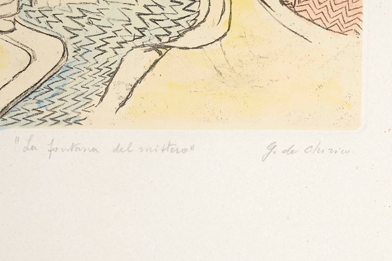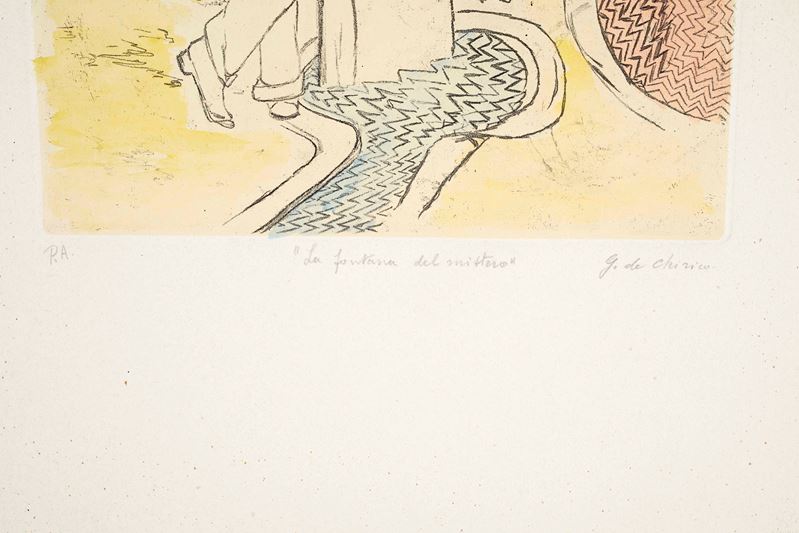 GIORGIO DE CHIRICO (Volos 1888 – Roma 1978) “La fontana del mistero”, 1971. Incisione a vernice molle su carta acquerellata a mano. Cm 70x50,5. Opera firmata in basso a destra G. de Chirico. Reca numeri di tiratura in basso a sinistra p.a. Opera intitolata in basso al centro La fontana del mistero. Reca timbro a secco di Alberto Caprini Stampatore Roma in basso a destra. Reca timbro a secco Giorgio de Chirico in basso a sinistra.