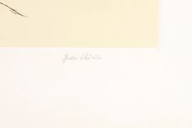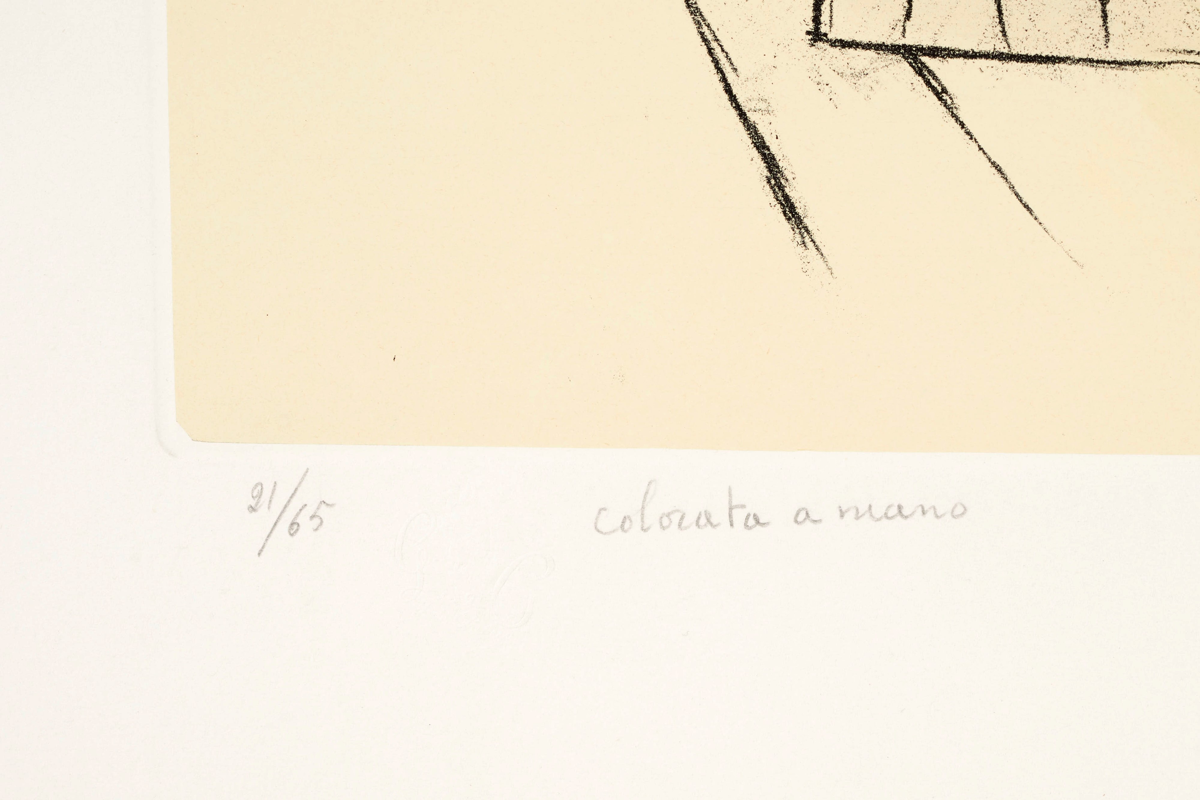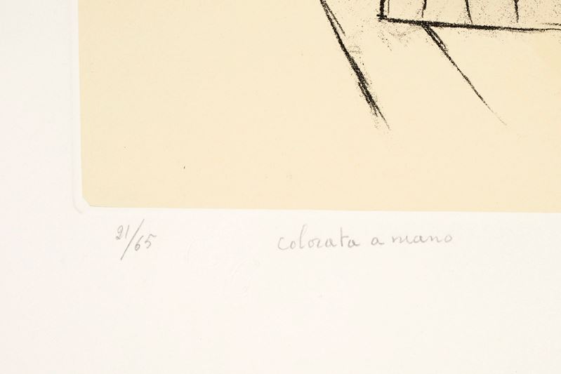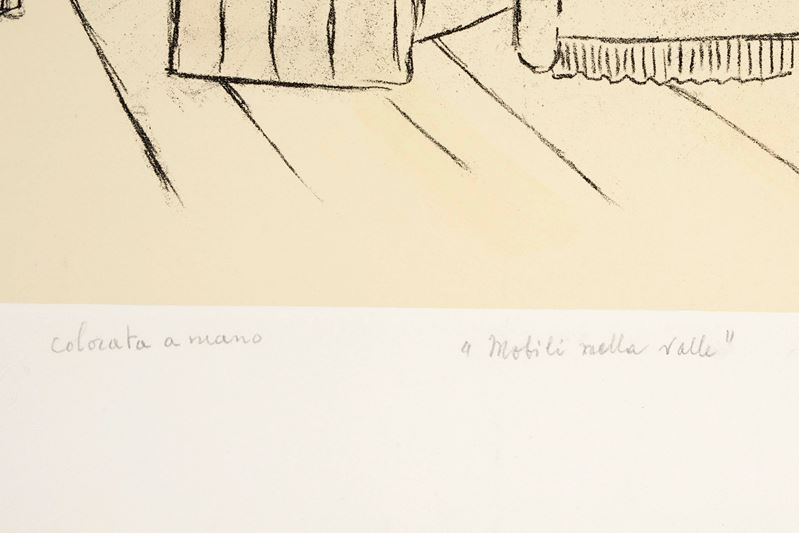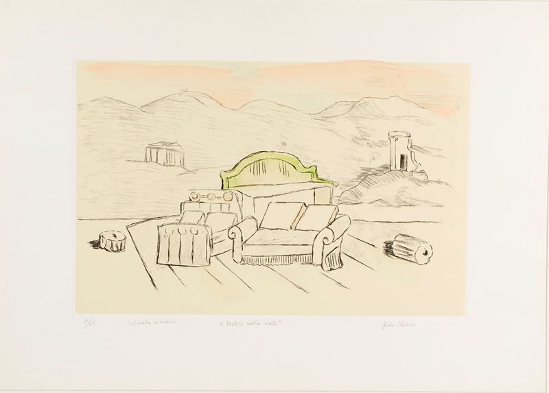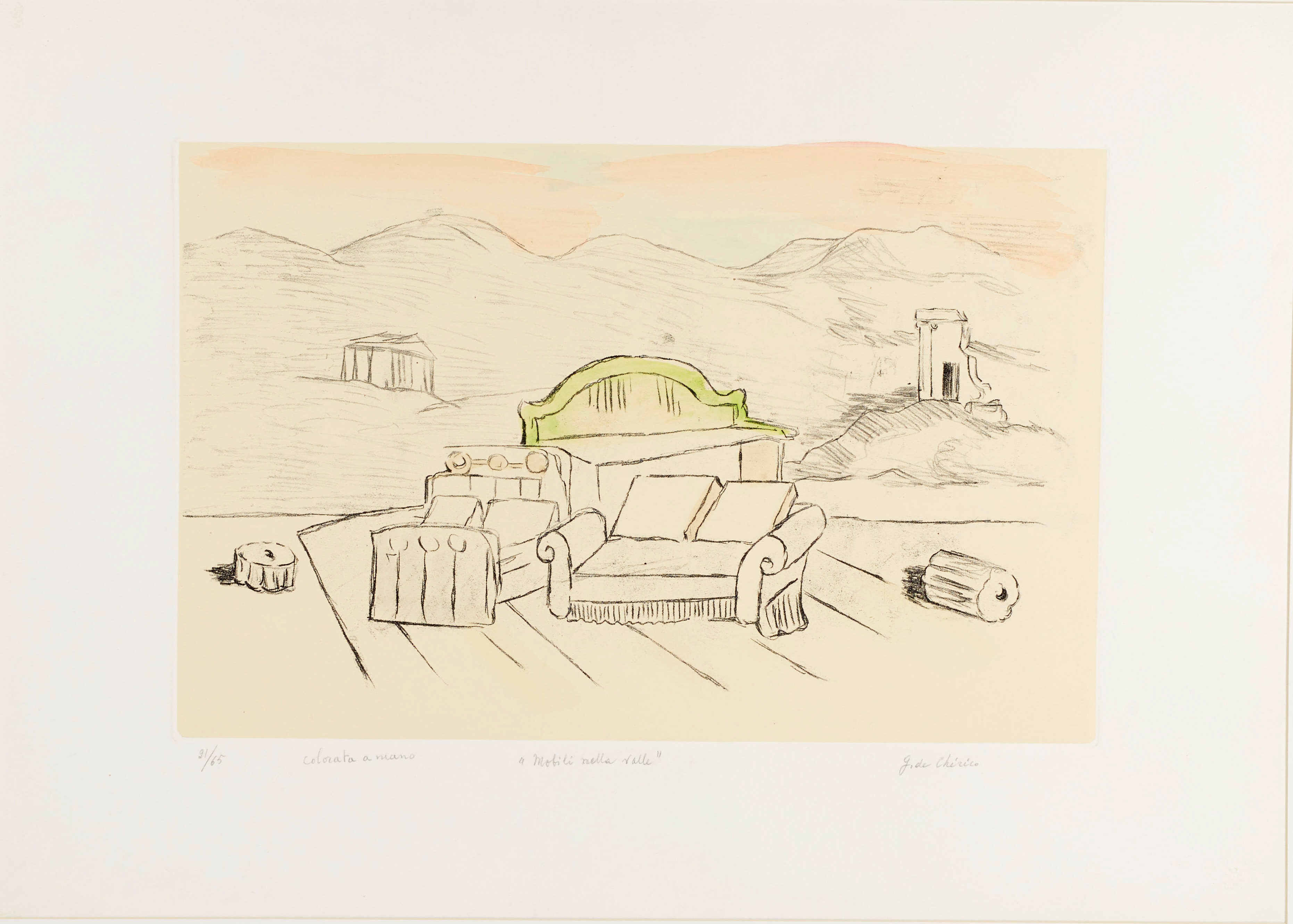 GIORGIO DE CHIRICO (Volos 1888 – Roma 1978) “Mobili nella valle”, 1971. Incisione a vernice molle su carta colorata a mano dall'artista. Cm 50x70. Opera firmata in basso a destra G. de Chirico. Reca numeri di tiratura in basso a sinistra 21/65. Opera intitolata in basso al centro Mobili nella valle. Reca scritta colorata a mano. Reca timbro a secco di Alberto Caprini Stampatore Roma in basso a destra. Reca timbro a secco Giorgio de Chirico in basso a sinistra.