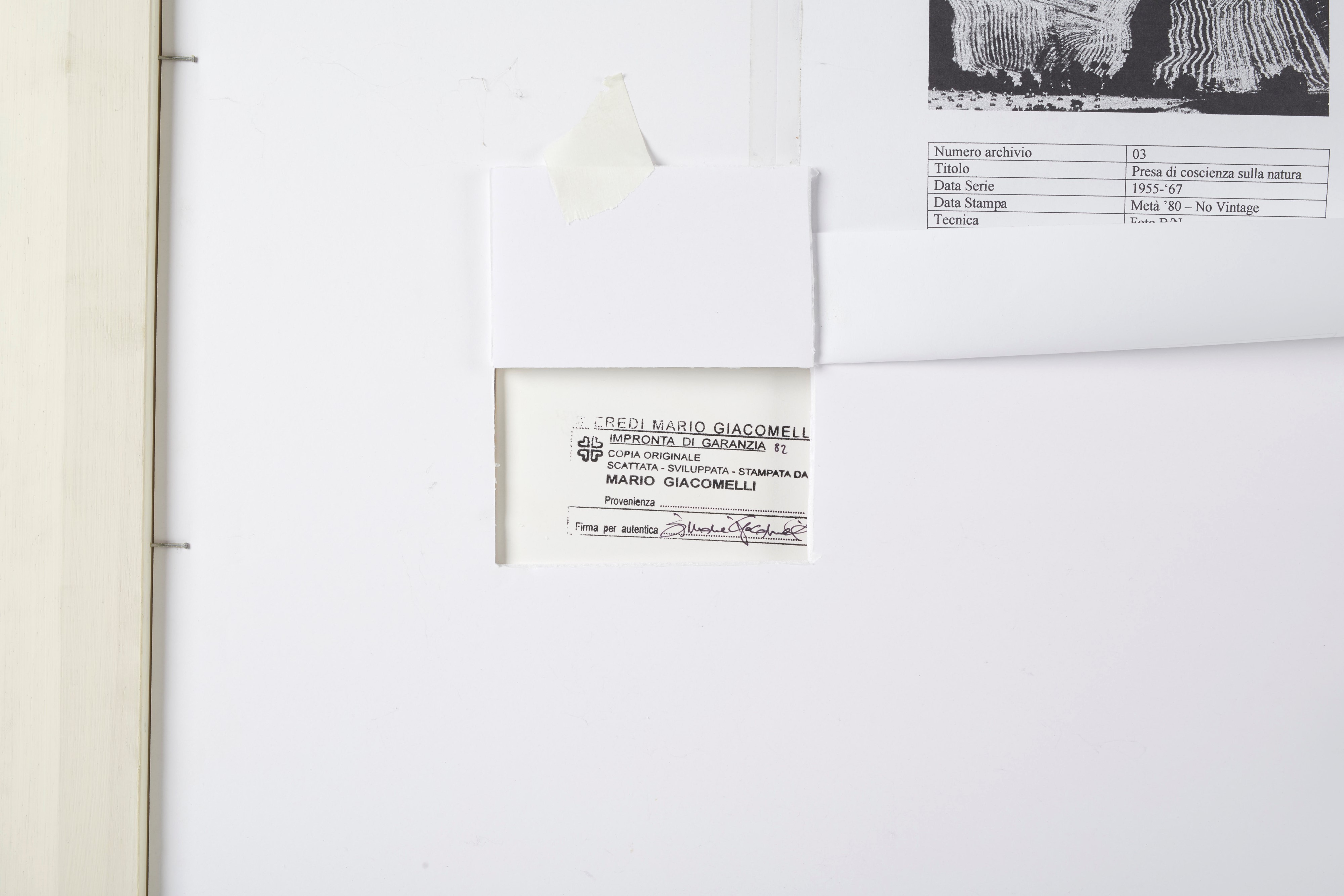 MARIO GIACOMELLI (Senigallia 1925 - 2000) "Presa di coscienza sulla natura", data serie 1955 - 1967; data stampa metà 1980. Fotografia in bianco e nero. Cm 30,5x40,5. Al retro reca timbro Mario Giacomelli Senigallia, Italia e timbro Eredi Mario Giacomelli a firma Giacomelli.