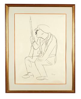 Il presente disegno è uno schizzo preparatorio per una tavola pubblicata a pagina 126 del volume Das neue Gesicht der herrschenden Klasse, edito da Malik Verlag nel 1930. L’opera appartiene al ciclo grafico in cui Grosz sviluppa i temi sociali e politici che avevano caratterizzato la sua produzione fin dalla Prima guerra mondiale. La figura rappresenta un uomo armato in abiti da lavoratore, un’immagine che Grosz utilizza per denunciare la militarizzazione della società tedesca negli anni del conflitto e per suggerire, con forte carica satirica, un possibile “nuovo volto” della classe dominante. Il riferimento al Wetterleuchten (letteralmente “bagliore del temporale”, talvolta usato in senso metaforico come presagio di violenza bellica o agitazione sociale) rafforza la lettura politico-espressionista dell’opera. Un raro esempio di materiale preparatorio legato a uno dei libri più rappresentativi della produzione grafica di Grosz, particolarmente significativo per comprendere il suo impegno antimilitarista e la critica sociale negli anni della Kaiserzeit e della Weimarer Republik.