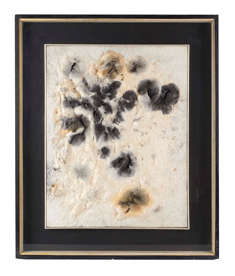 FRANS KRAJCBERG (Kozienice 1921 - Rio de Janeiro 2017) "Superficie lunare", 1961. Olio e tecnica mista su tela. Cm 59x46. Opera firmata e datata in basso a sinistra FKrajcberg 61. Al retro opera firmata e datata FKrajcberg 61. Al retro reca dedica. Al retro riporta etichetta Galleria d'arte del Naviglio, Milano.