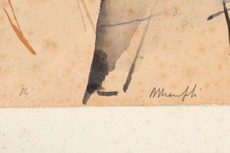 ALBERTO MANFREDI (Italy 1930 - Reggio Emilia 2001) "Figure". Acquerello su carta. Cm 45,5x30,5. Opera firmata in basso al centro Manfredi. Al retro reca etichetta Alberto Manfredi.