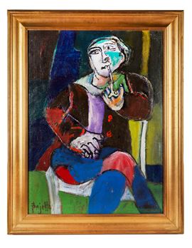 GUIDO PAJETTA (Monza 1898 - Milano 1987) "Il fumatore di pipa", 1980. Acrilico su tela. Cm 80x60. Opera firmata in basso a sinistra Pajetta. Al retro reca numero di archivio 948. Opera accompagnata da autentica su fotografia con timbro dell'Archivio a cura di Giorgio Pajetta.