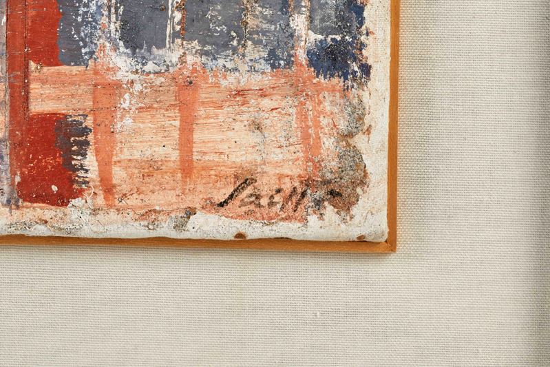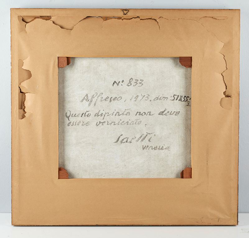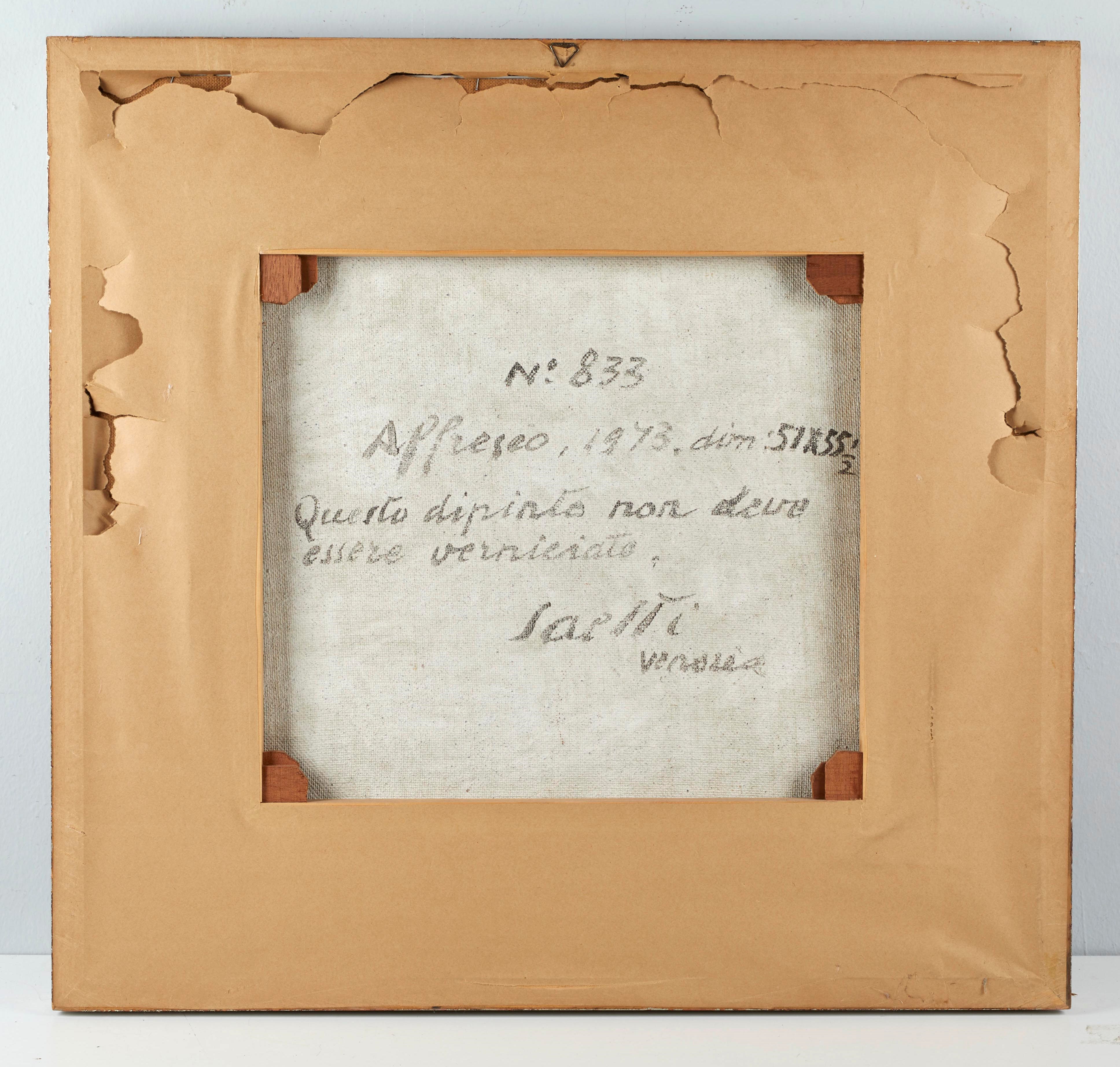 BRUNO SAETTI (Bologna 1902 - 1984) "Paesaggio col sole", 1973. Affresco su tela. Cm 51x55,5. Opera firmata in basso a destra Saetti. Al retro opera datata e firmata Saetti, Venezia, 1973. Al retro reca probabile numero di archivio.