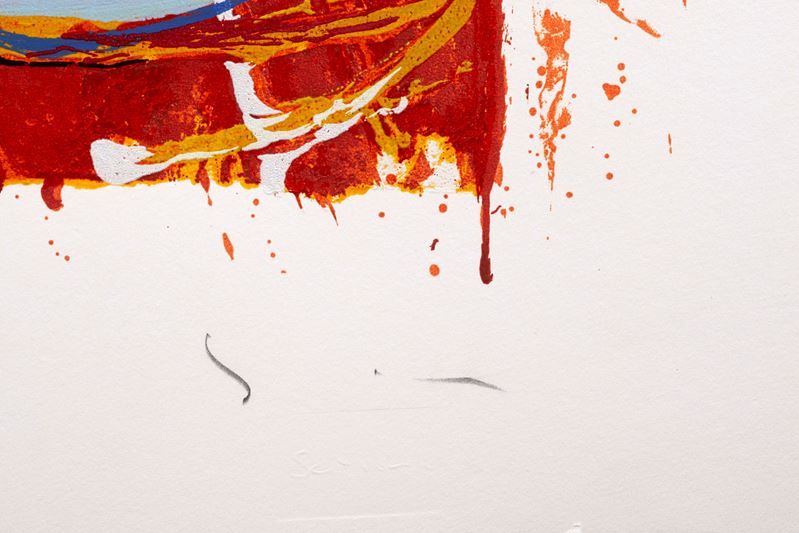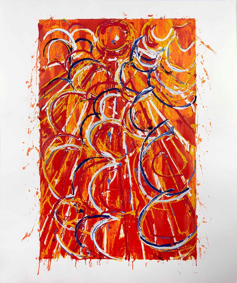 MARIO SCHIFANO (Homs 1934 – Roma 1998) “Nella vetrata rossa”. Serigrafia polimaterica su carta. Cm 120x100. Opera firmata in basso a destra Schifano. Reca in basso a sinistra numeri di tiratura p.a.
