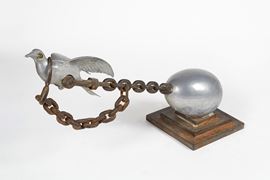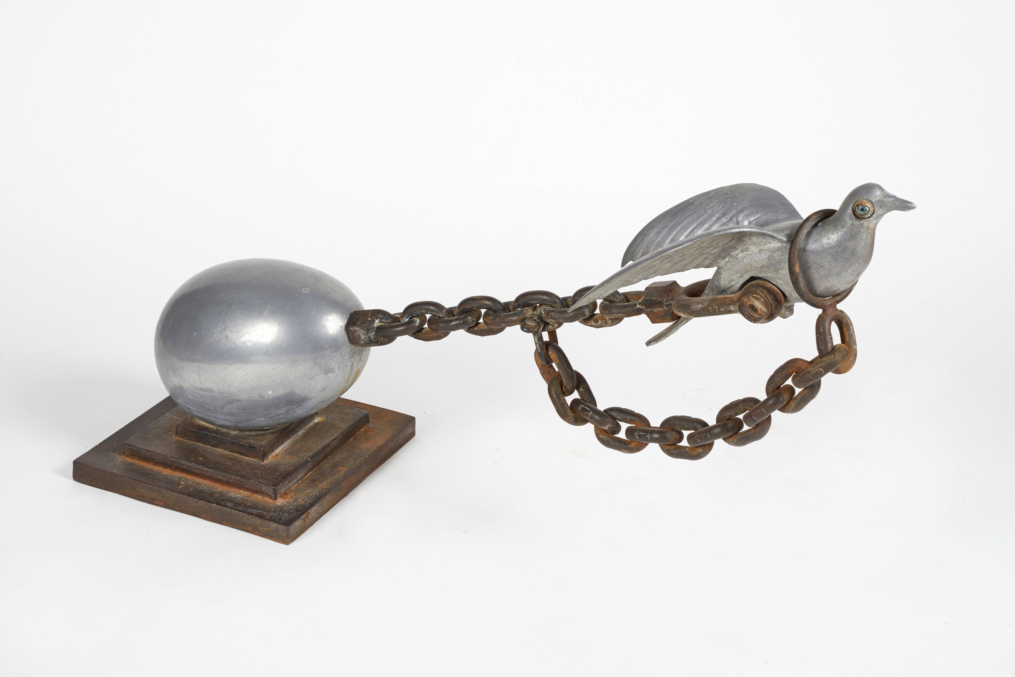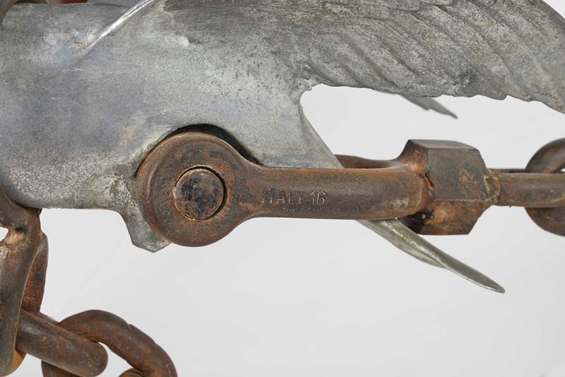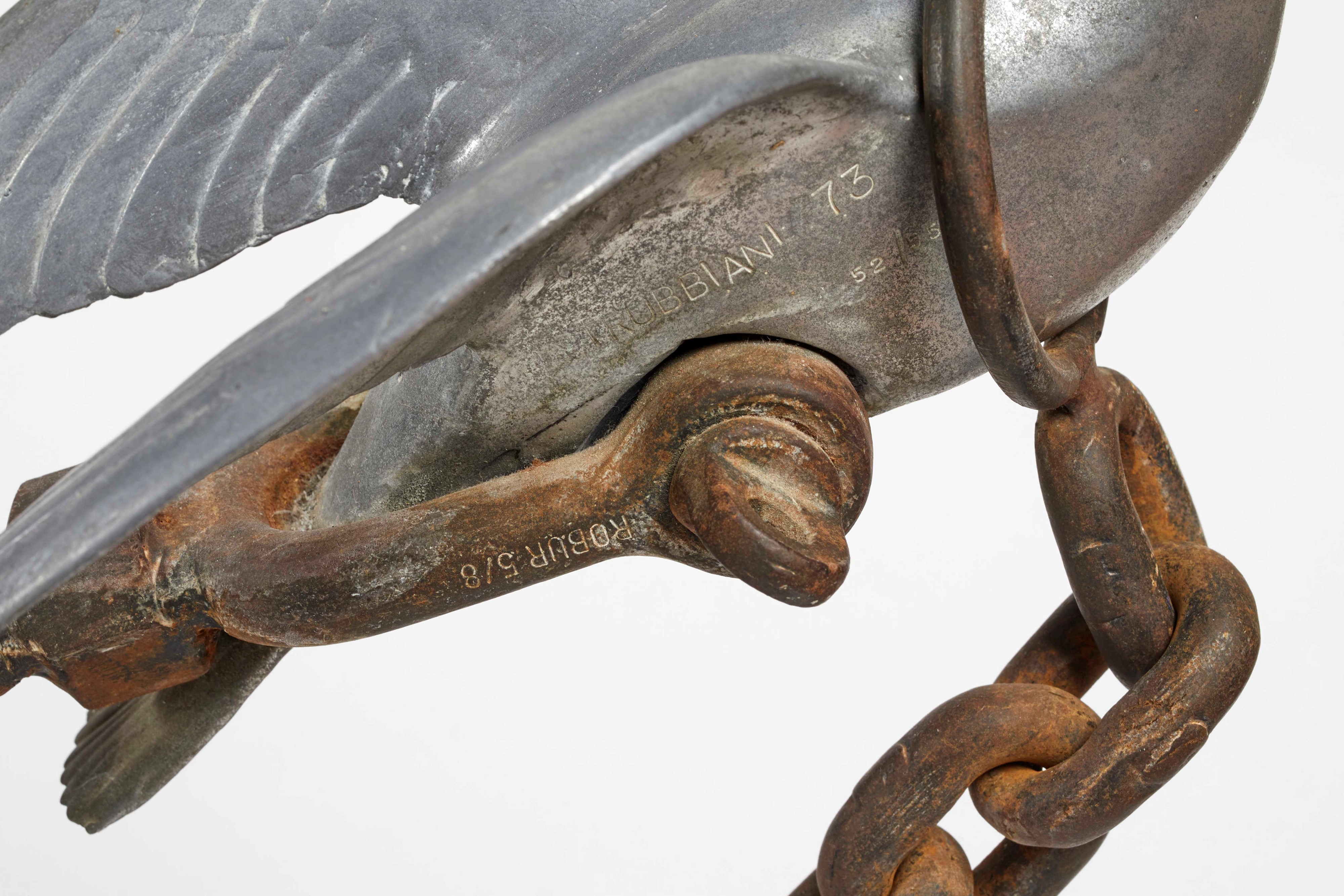 VALERIANO TRUBBIANI (Macerata 1937) "Colombo viaggiatore", 1973. Scultura in alluminio e ghisa. Cm 40x81x24,5. Opera firmata Trubbiani e datata 73. Reca numeri di tiratura 52/55. Reca marchio Venturi Arte.