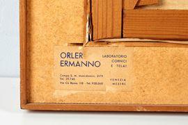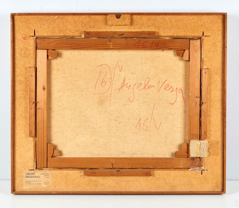 ANGELO VERGA (Milano 1933 - 1999) "Senza titolo". Olio su tela. Cm 40x50. Opera firmata al retro Angelo Verga. Al retro reca etichetta Orler Ermanno, Venezia e vari timbri della mostra presso la Galleria Zen di Brescia. Al retro reca etichetta dello studio dell'artista.