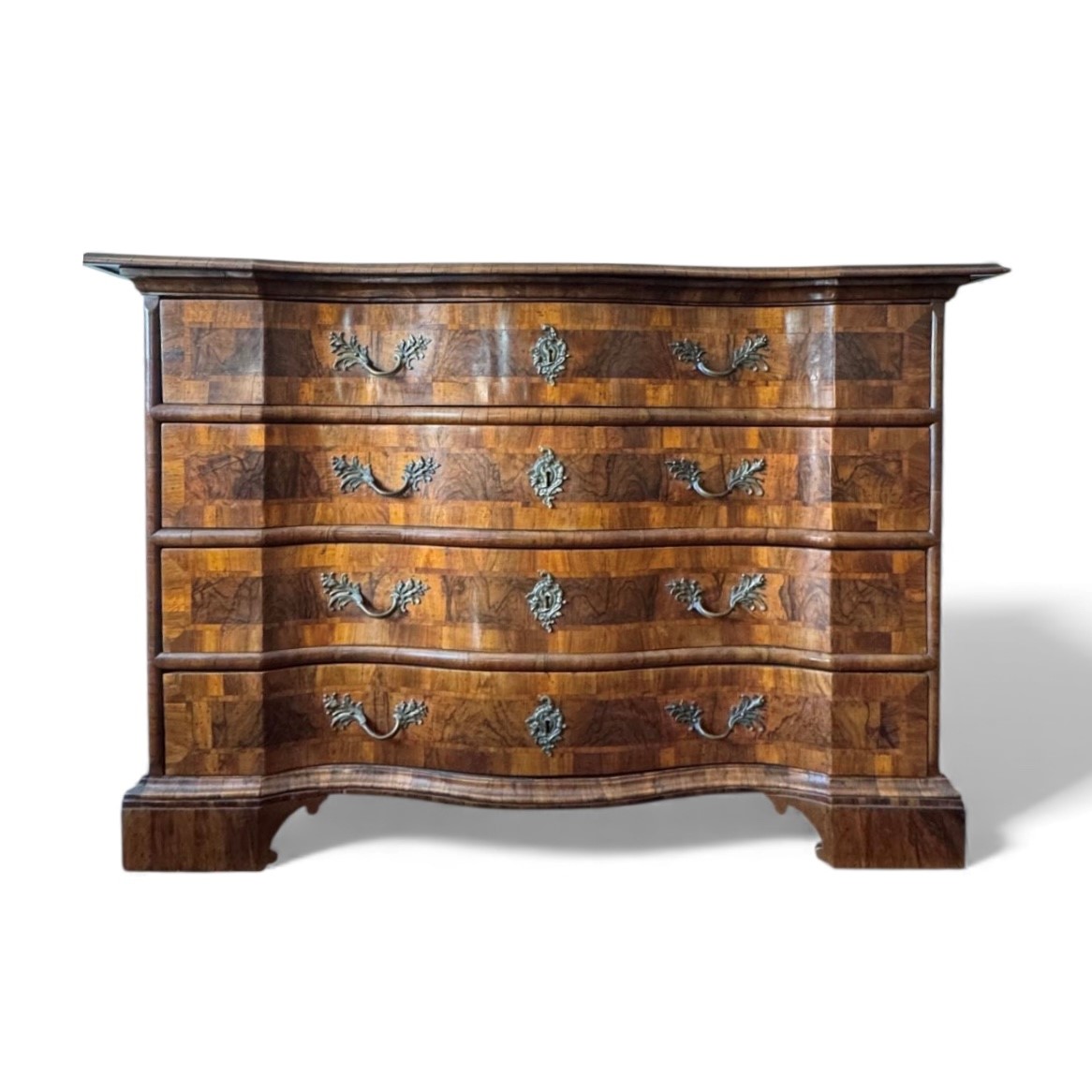 Canterano a quattro cassetti a fronte mosso, lastronato in radica di noce e filetti in acero. Schiena originale e maniglie coeve. XVIII secolo, Bologna. Cm 100x111x66.