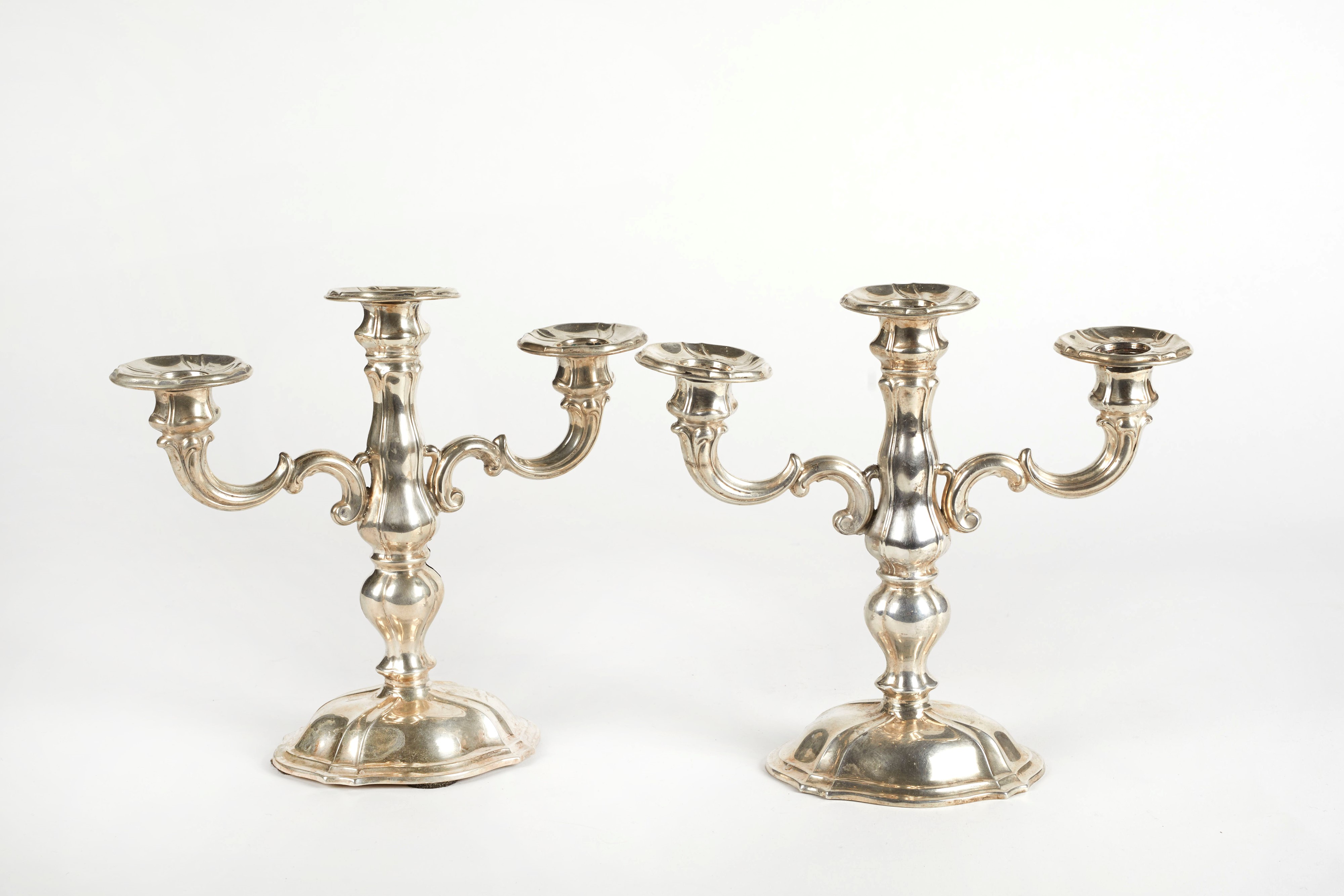Coppia di candelabri in argento 800. Cm cadauno 21x21. Recano punzone 800. Peso complessivo: 939 gr.