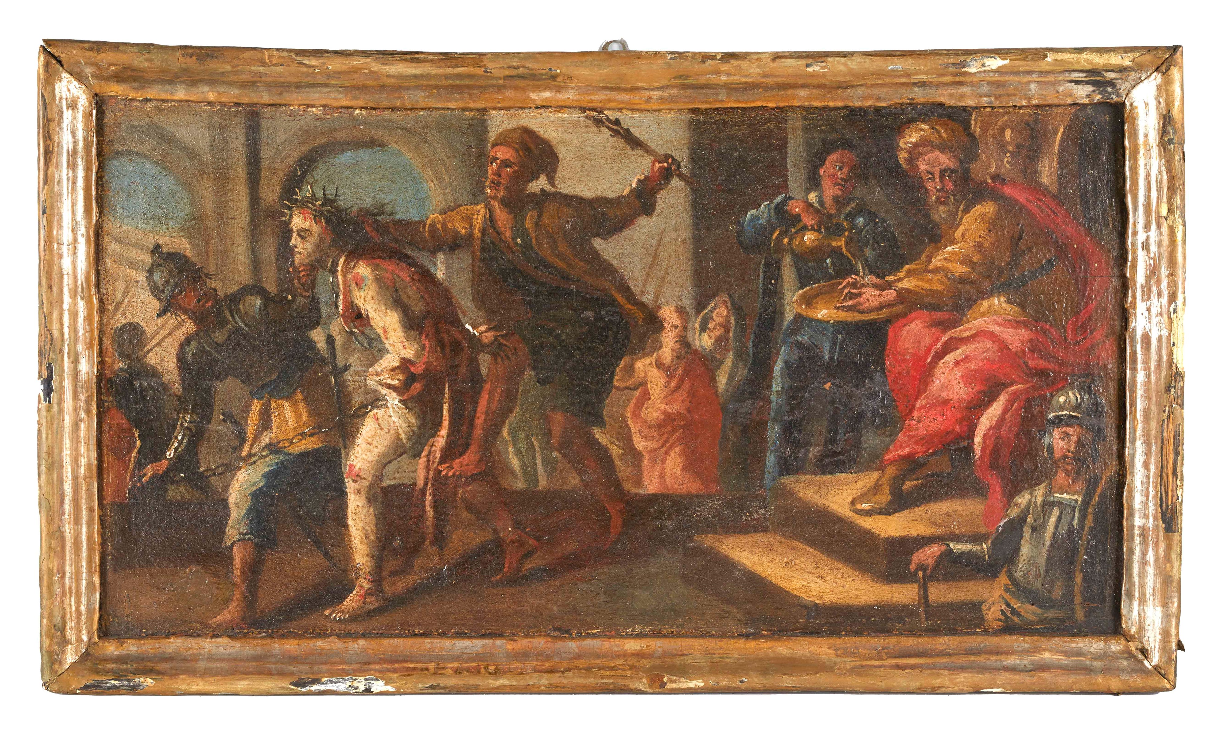 Maestro del XVII secolo, "Incoronazione di spine". Olio su tavola. Cm 24,5x47,5.