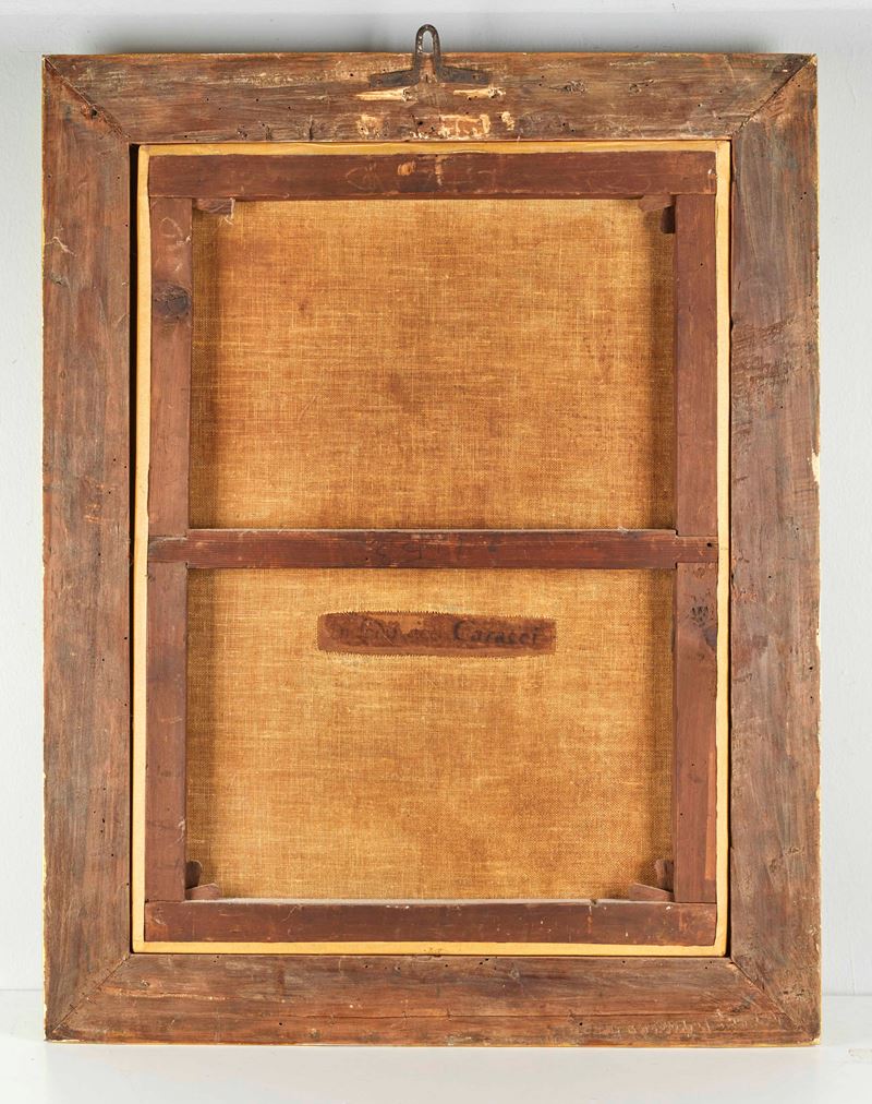 Maestro emiliano degli inizi del XVII secolo, "Madonna con Bambino". Olio su tela. Cm 72x53. Al retro reca scritta Ludovico Carracci.