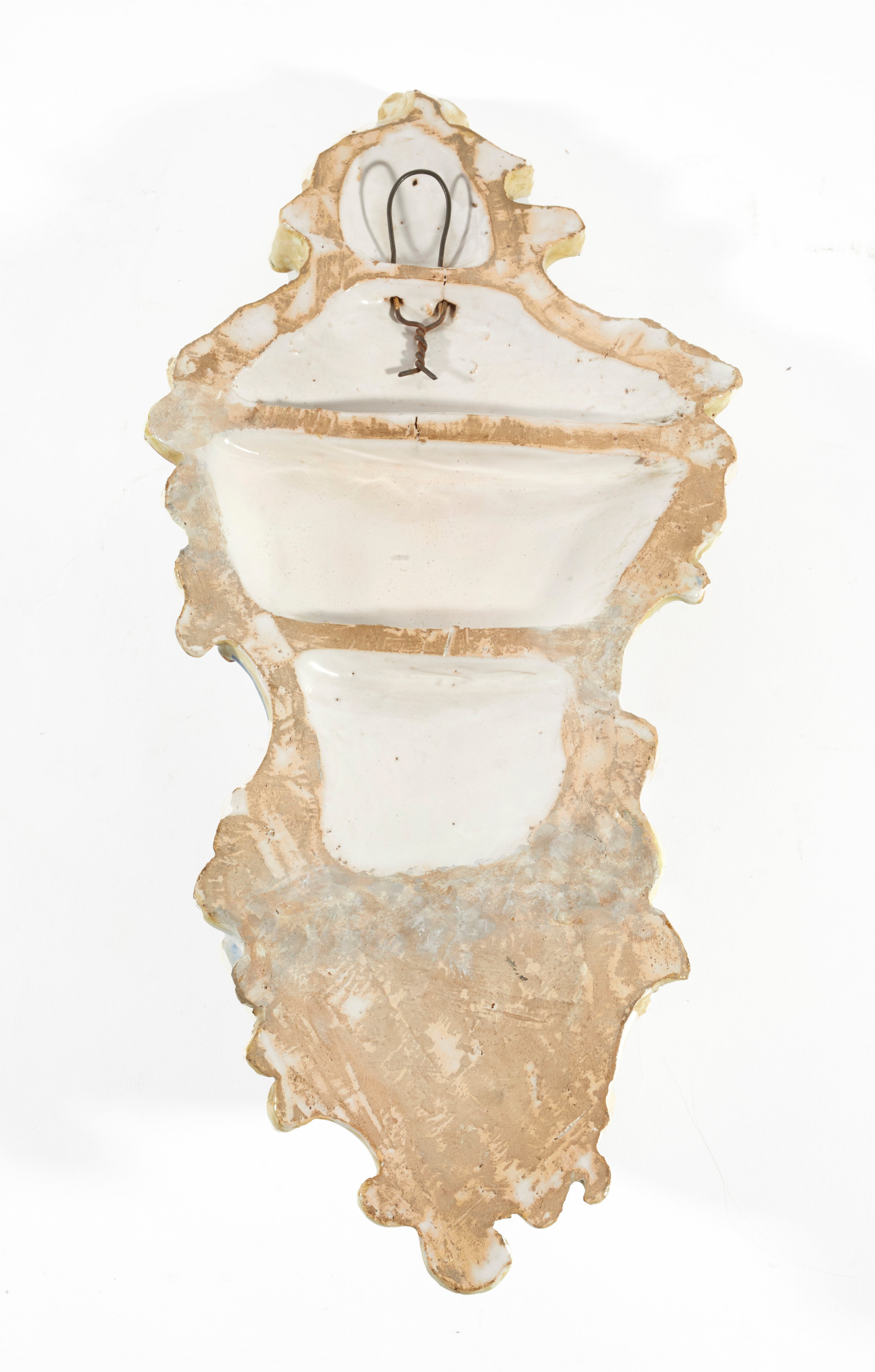 MANIFATTURA MINGHETTI Acquasantiera in maiolica policroma, con coro di angeli. Cm 37,5x17,5x8. Opera firmata M.