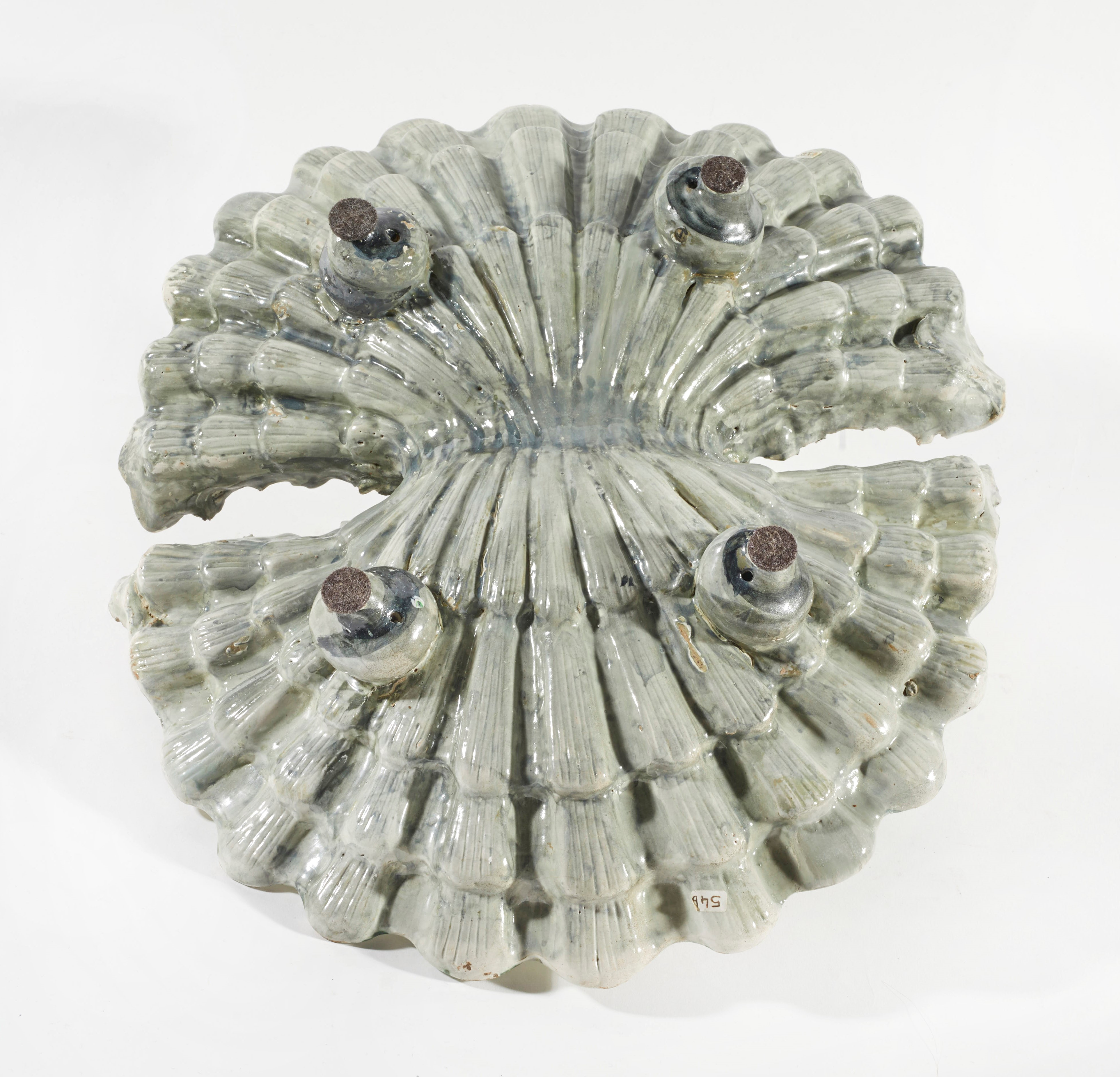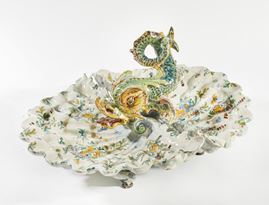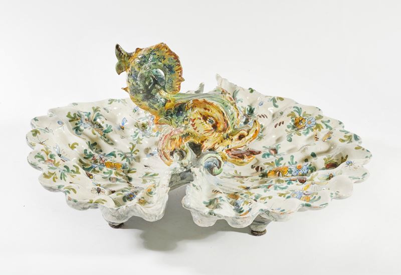 MANIFATTURA ANGELO MINGHETTI Centrotavola a doppia valva con tritone. Reca decoro a ticchiolo con insetti. Valve ondulate Cm 23x45x40. Firmato sul decoro. 1880 - 1990.