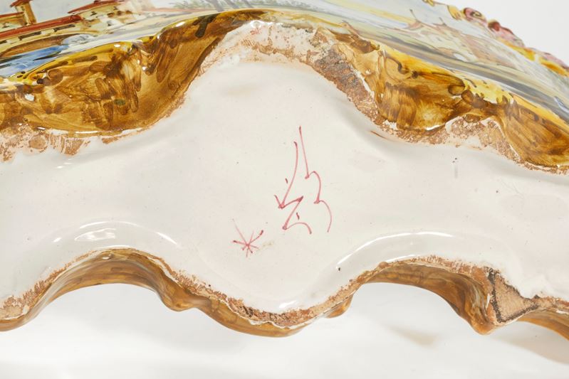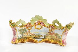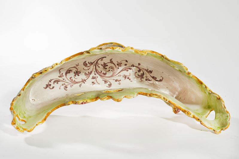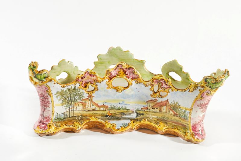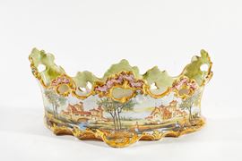 MANIFATTURA MINGHETTI Giardiniera a mezzaluna con paesaggio e archiettura e decoro a motivi vegetali. Cm 12x30x8. Reca firma AMF in rosso.