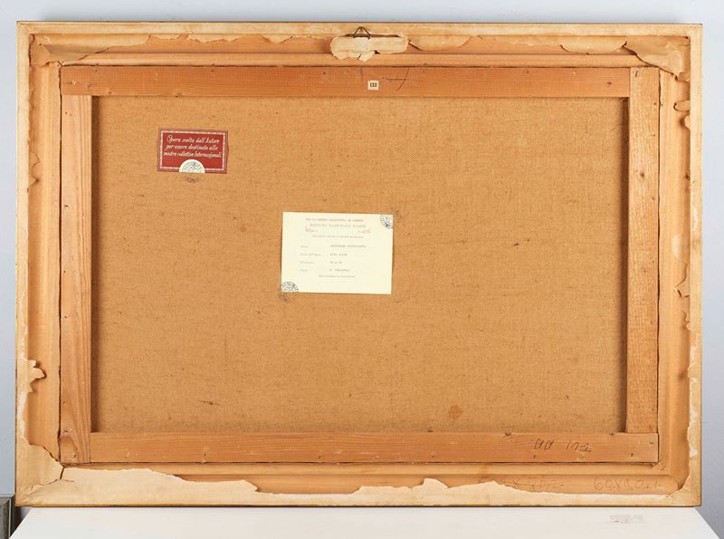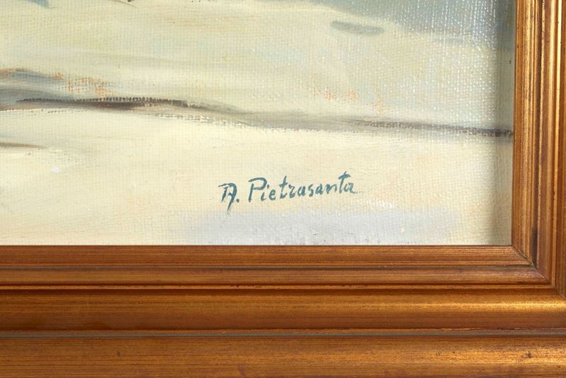 ANTONELLO PIETRASANTA "Montagne". Olio su tela. Cm 59x91. Opera firmata in basso a destra A. Pietrasanta. Al retro reca etichetta partecipazione alla Mostra Collettiva Internazionale.