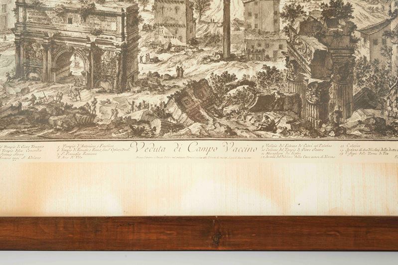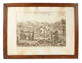 GIOVANNI BATTISTA PIRANESI (Mogliano 1720 - Roma 1778) "Veduta di Campo Vaccino". Acquaforte su carta. Cm lastra 37x53.