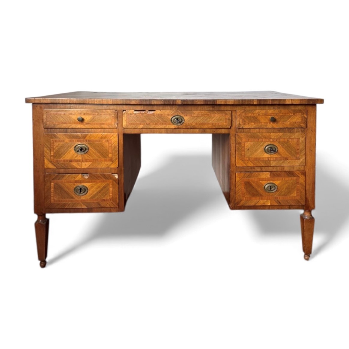 Scrivania da centro Luigi XVI lastronata in noce, con gamba a tronco piramidale strozzata e pallina sotto. Fine del XVIII secolo - inizi del XIX secolo, Emilia. Cm 82x140x79.