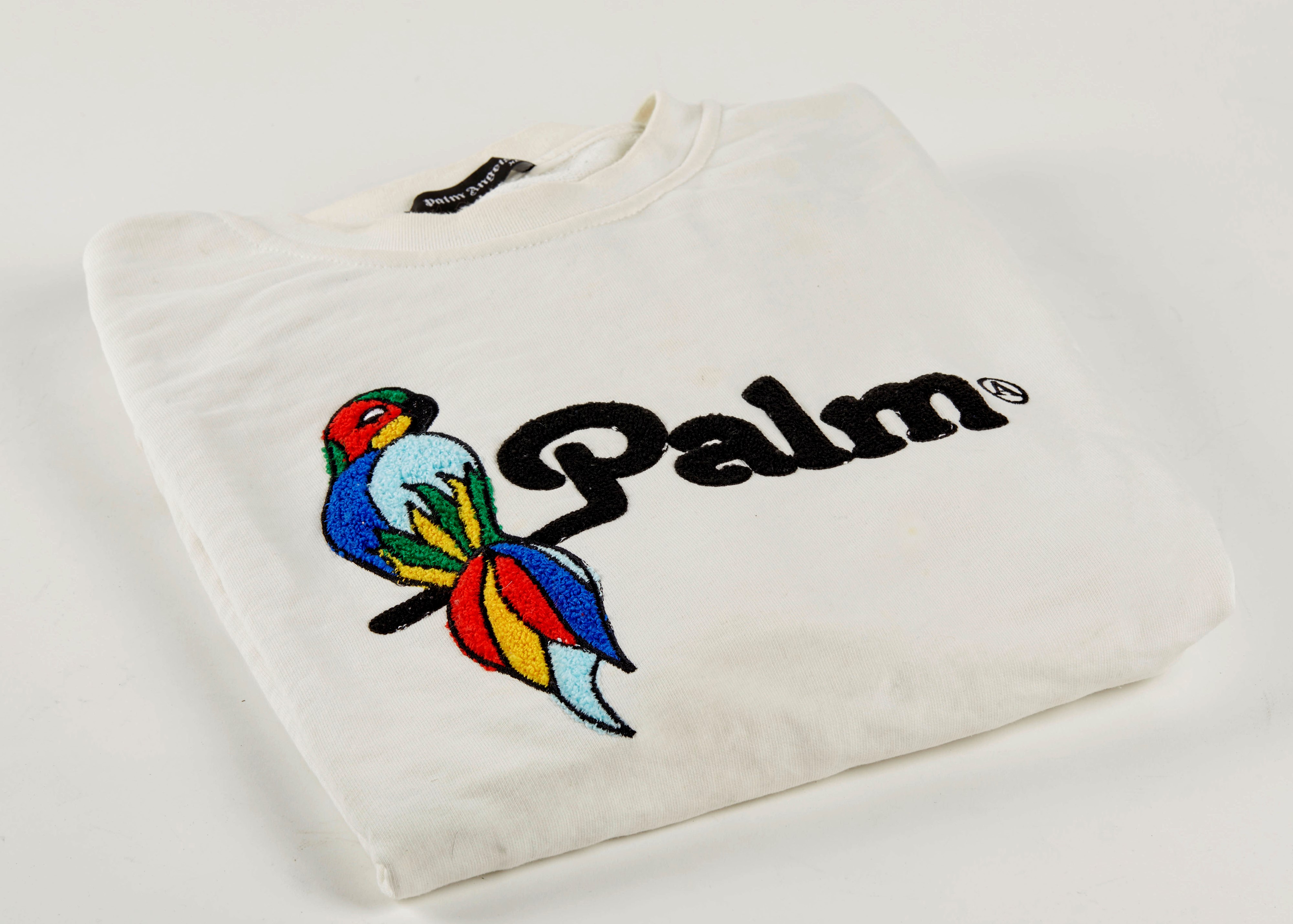 PALM ANGELS Felpa in cotone bianco con decorazione in tessuto a forma di pappagallo. Taglia XL. Reca etichetta Palm Angels. (lievi difetti)