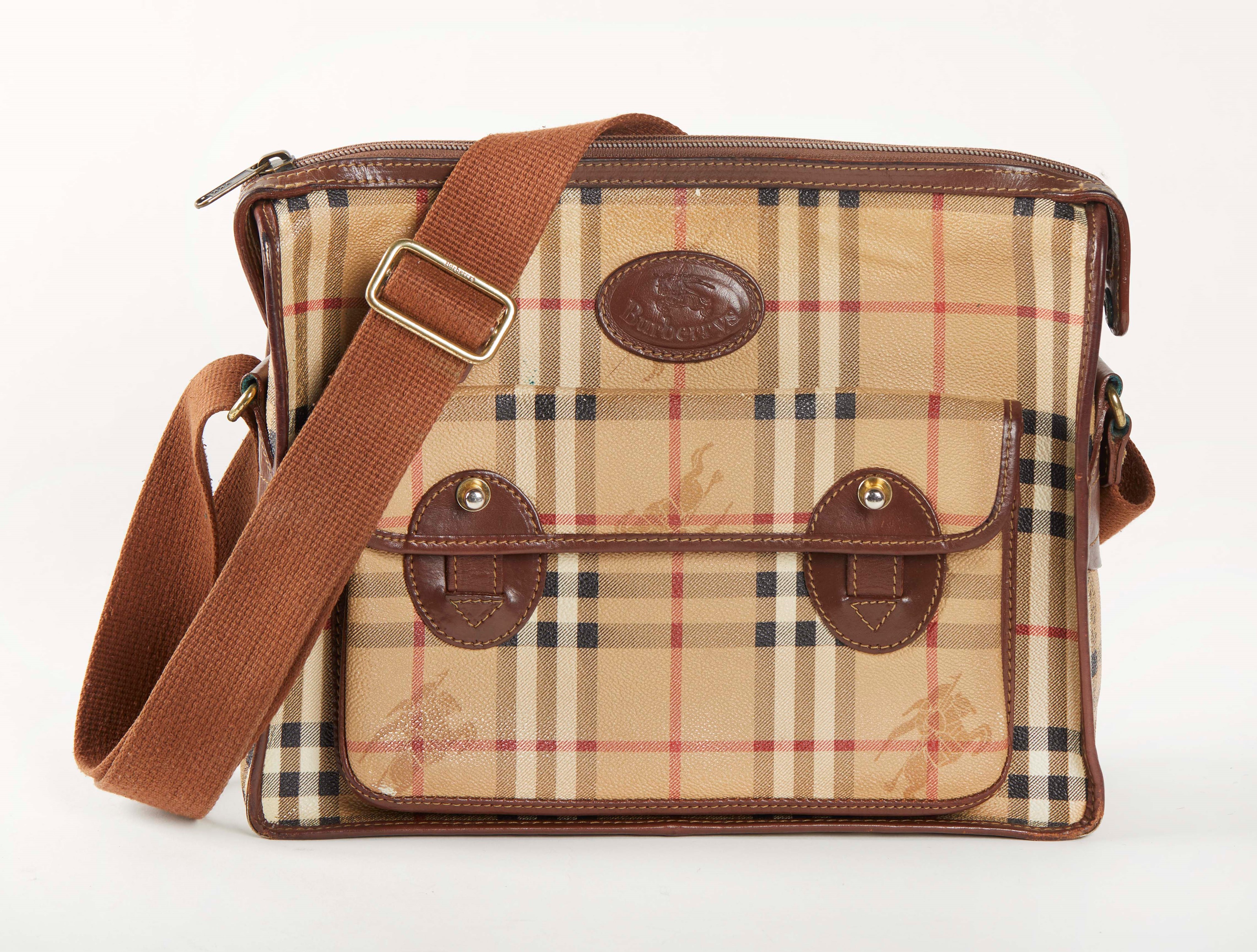 BURBERRYS Borsa a tracolla in tela, con finiture in pelle e dettagli in metallo. Tracolla in tessuto e tasca sul davanti. Cm 25x30x10. Reca marchio Burberrys of London.