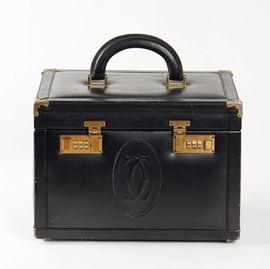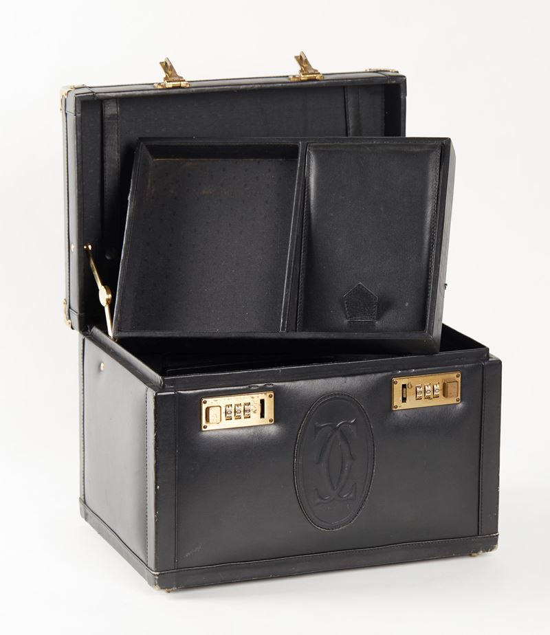 CARTIER Vanity in pelle nera e dettagli in metallo dorato. All'interno presenta scomparti e elastici dove riporre gli oggetti. (manca lo specchio interno). Cm 21,5x31,5x21,5. Reca logo Cartier. (lievi difetti)