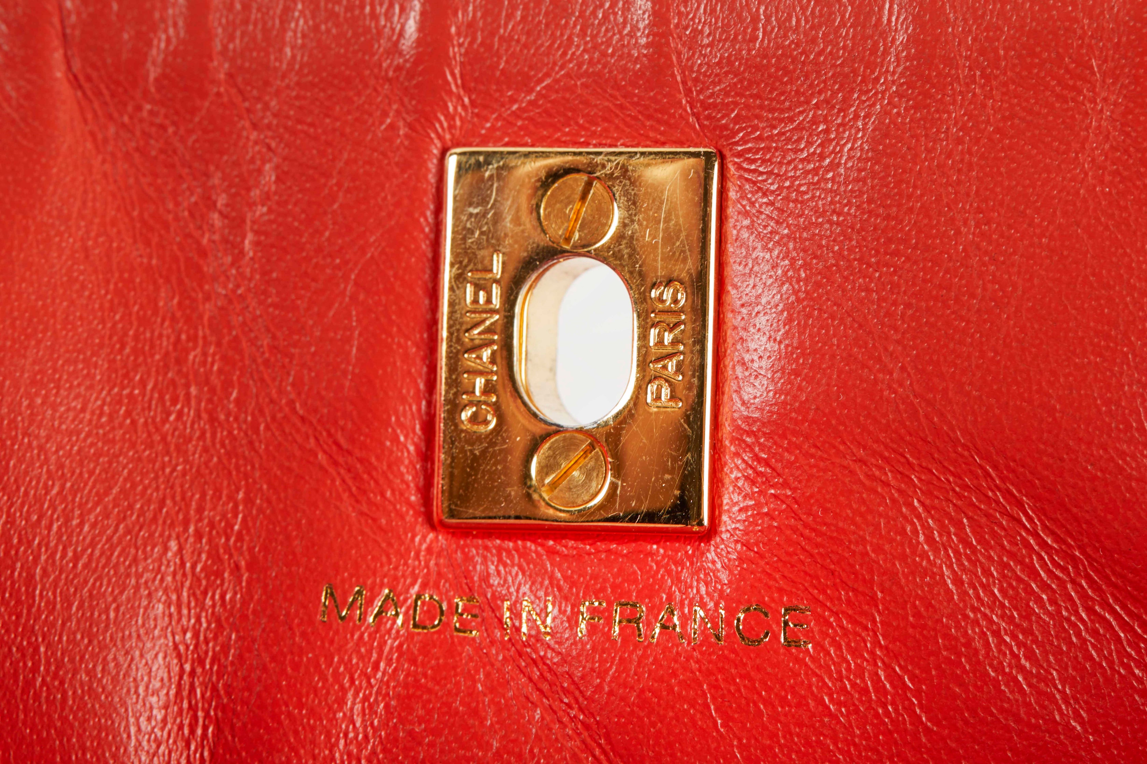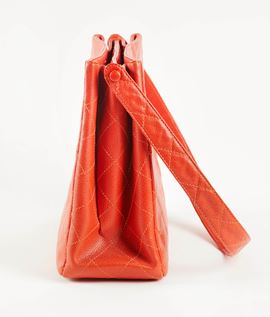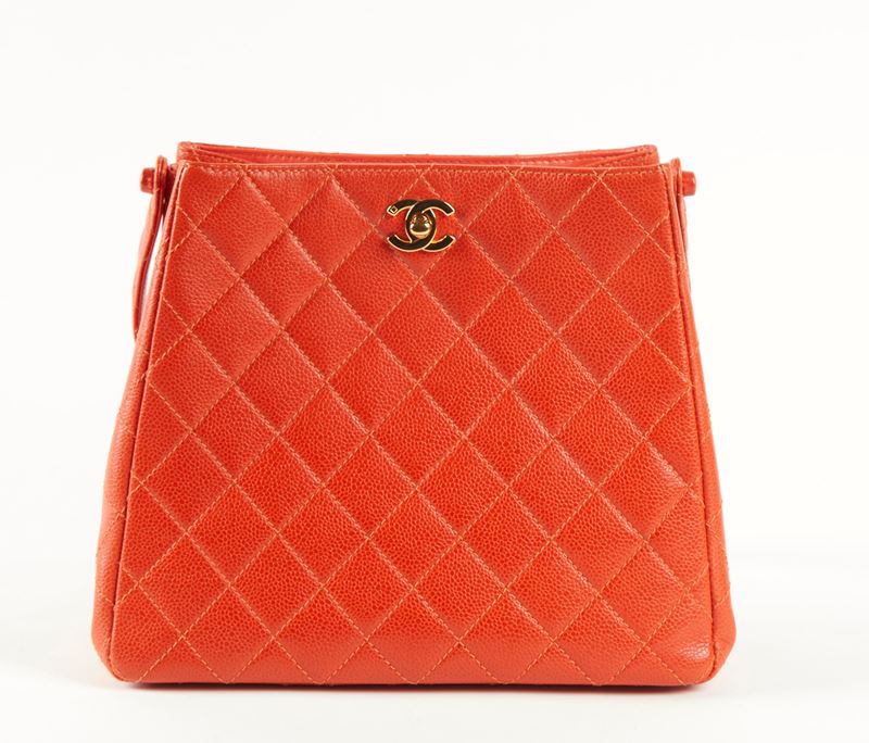 CHANEL Borsa a spalla in pelle di vitello martellata matelassé color arancione. 2005 - 2006. Internamente rifinita in pelle arancione e divisa in due scomparti. Doppia chiusura. Cm 23x27x12. Reca marchi CC, Chanel, Paris, Made in France e ologramma con codice riferimento prodotto.