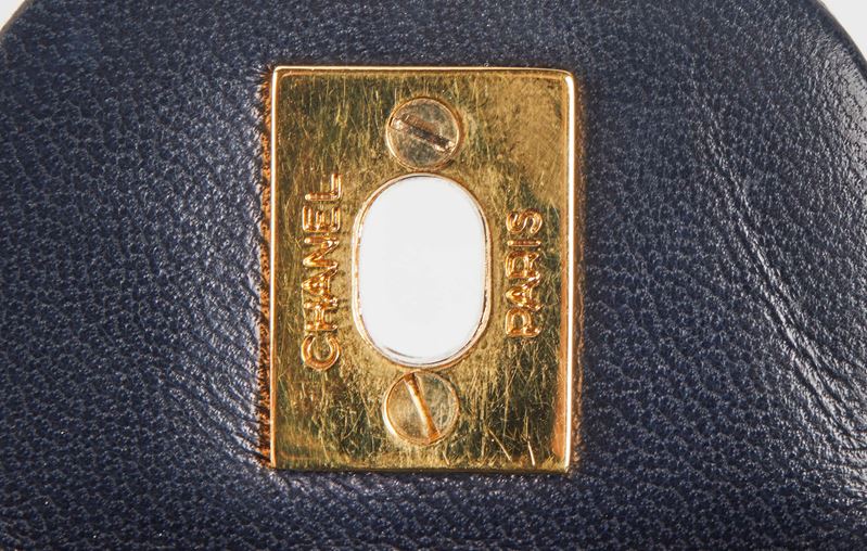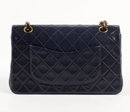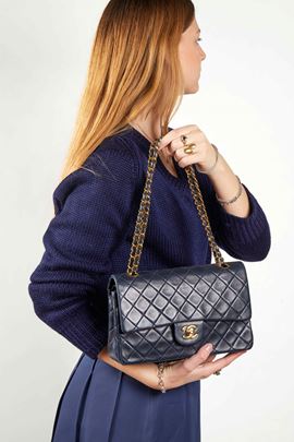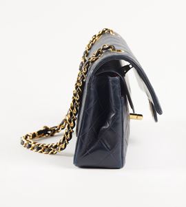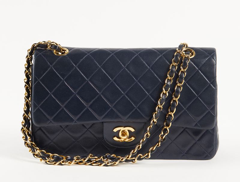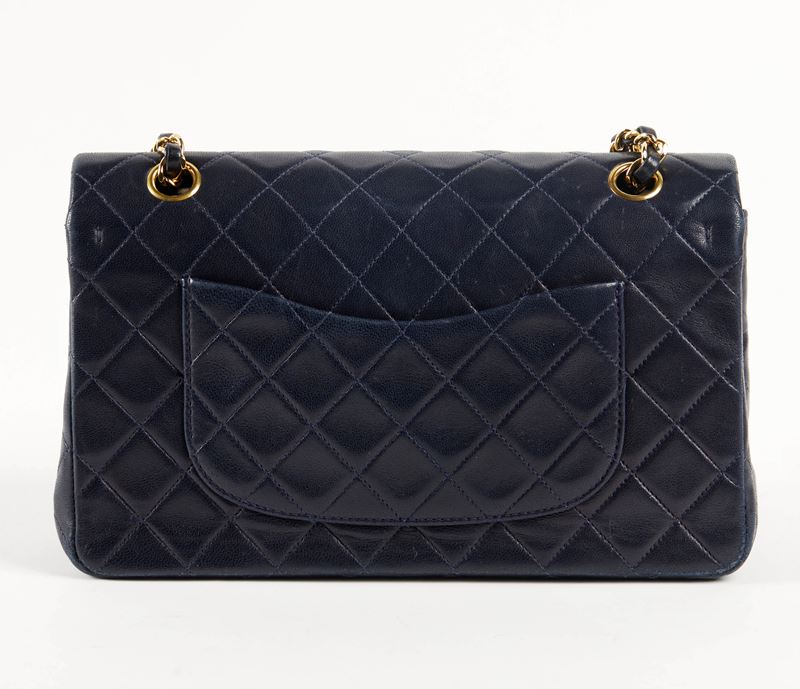 CHANEL Borsa modello Timeless double flap in pelle di agnello matelassé blu notte. Hardware in metallo dorato. 1997 - 1998. Cm 15x25x7. Internamente rifinita in pelle bordeaux. Reca marchi CC, Chanel, Made in France e ologramma di riferimento prodotto. Corredata di carta di autenticità. (lievissimi difetti)