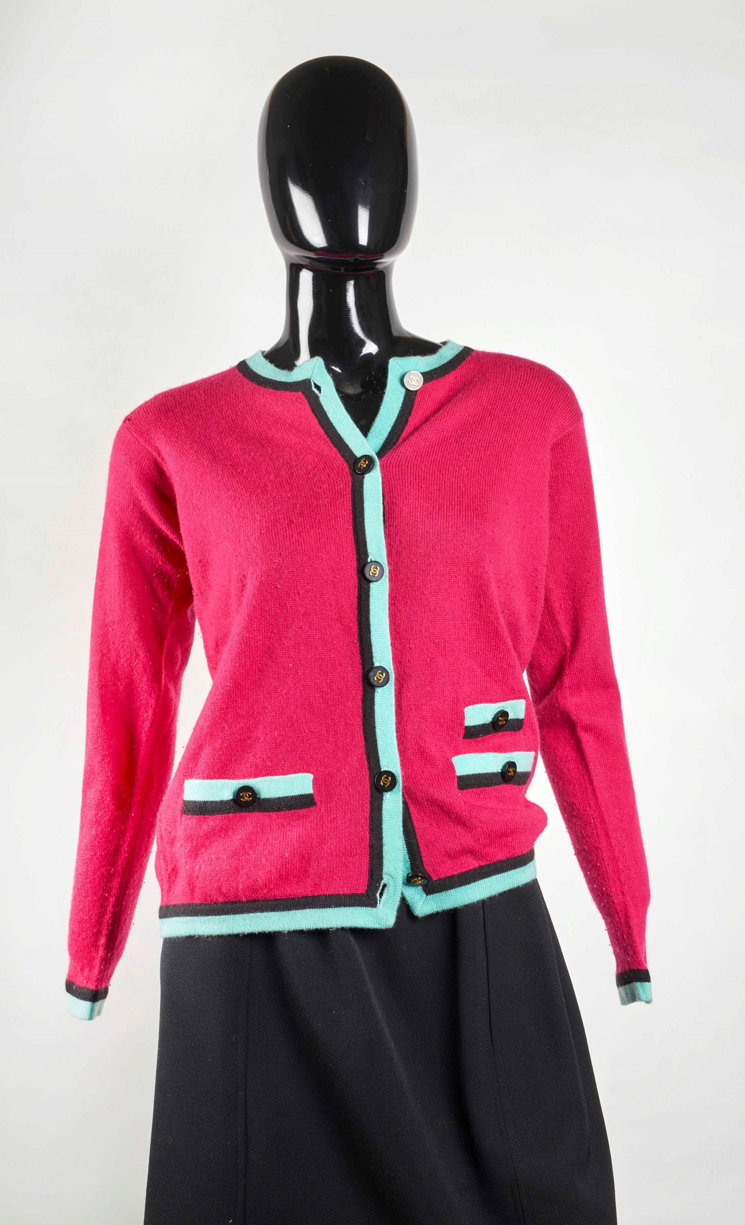 CHANEL Cardigan in lana fucsia con dettagli in azzurro e nero. Riporta tre tasche sul fronte e bottoni logati. Veste taglia IT 44 - 46. Reca etichetta Chanel. (difetti)