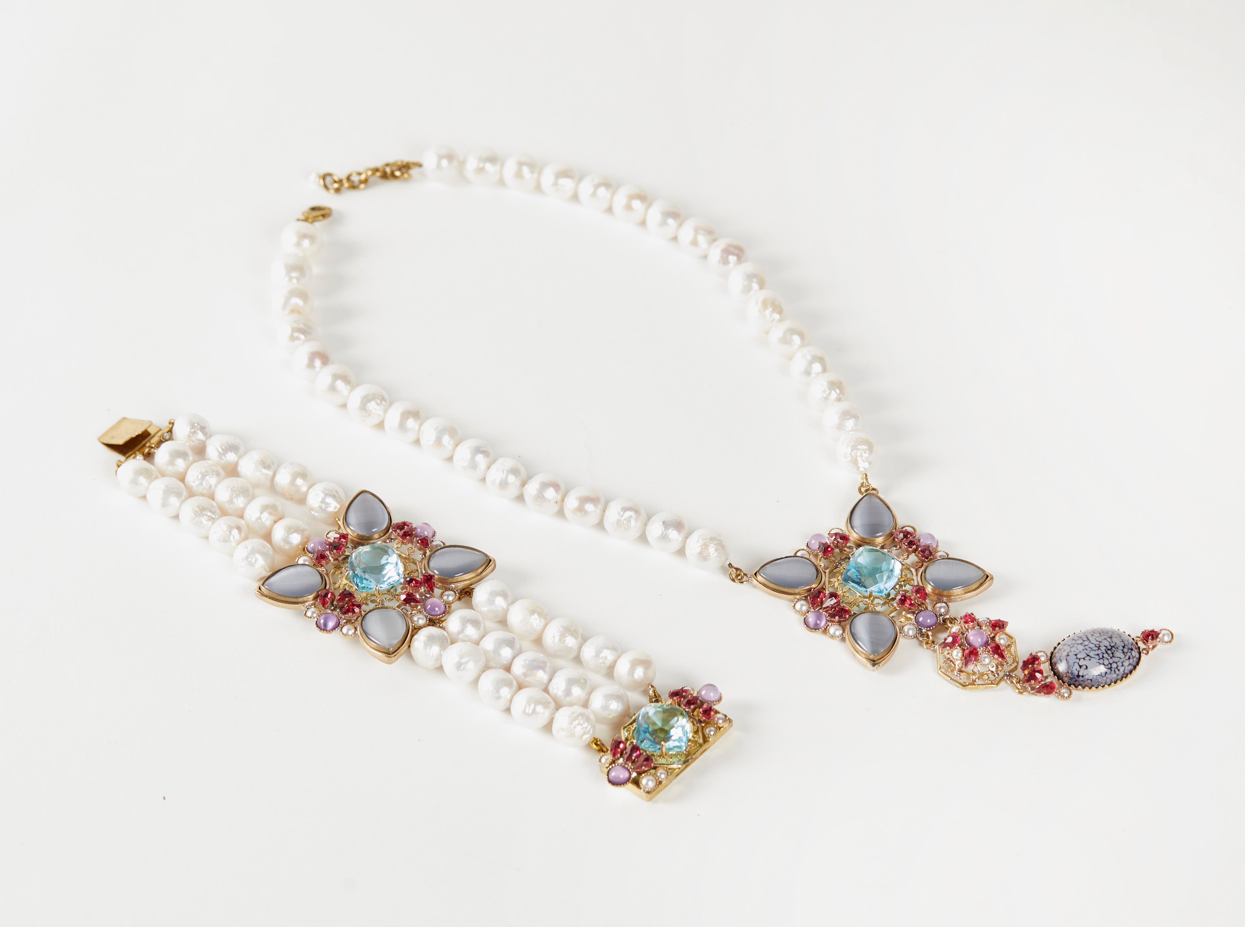 VINTAGE ITALY Demiparure composta da bracciale e collana in perle naturali e pietre colorate. Lunghezza bracciale: cm 21; lunghezza collana: cm 50. Recano marchio Vintage Italy.