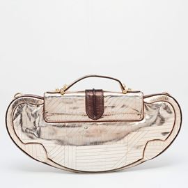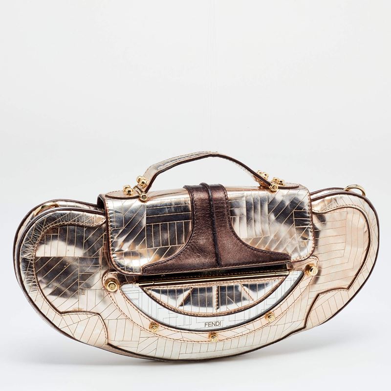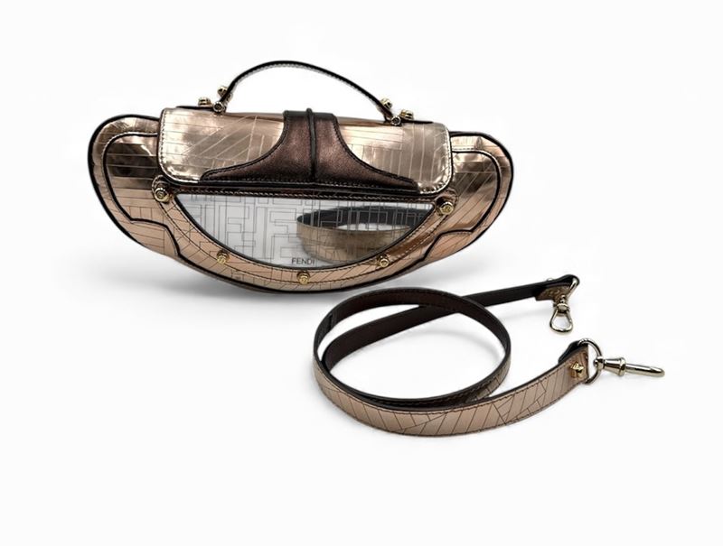 FENDI Borsa a mano Mirror in pelle laminata sui toni del bronzo e inserti in nappa color prugna. Tracolla removibile in pelle laminata. Cm 13x28x6. Reca marchi Fendi, FF, Made in Italy. Corredata di due certificati Fendi per pelle laminata e nappa.