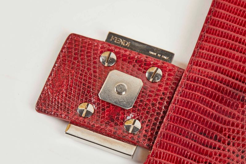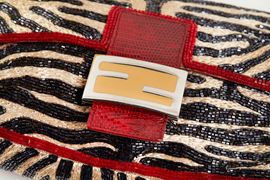FENDI Rara borsa Baguette Zebra, realizzata in rafia chiara intrecciata e perline nere e rosse. Inserti in pelle rossa a stampa pitone. Interni in Canvas e pelle a stampa pitone. Manico in pelle a stampa pitone e fibbie in metallo. Cm 15x25x6. Reca marchi Fendi, Made in Italy. Corredata di dustbag. (difetti)