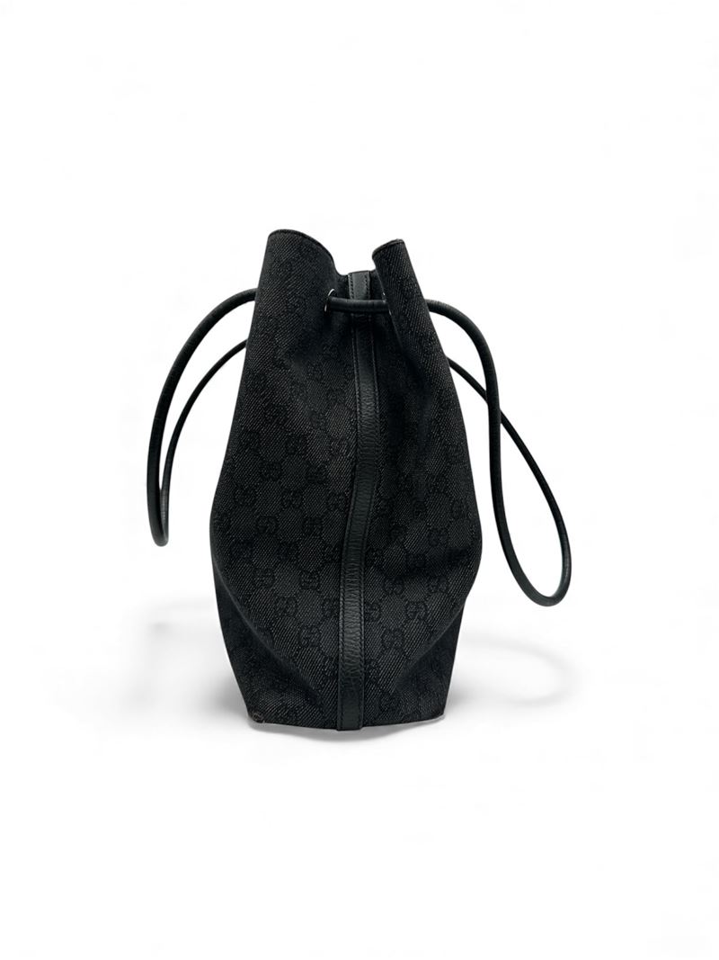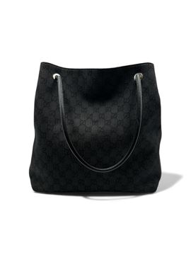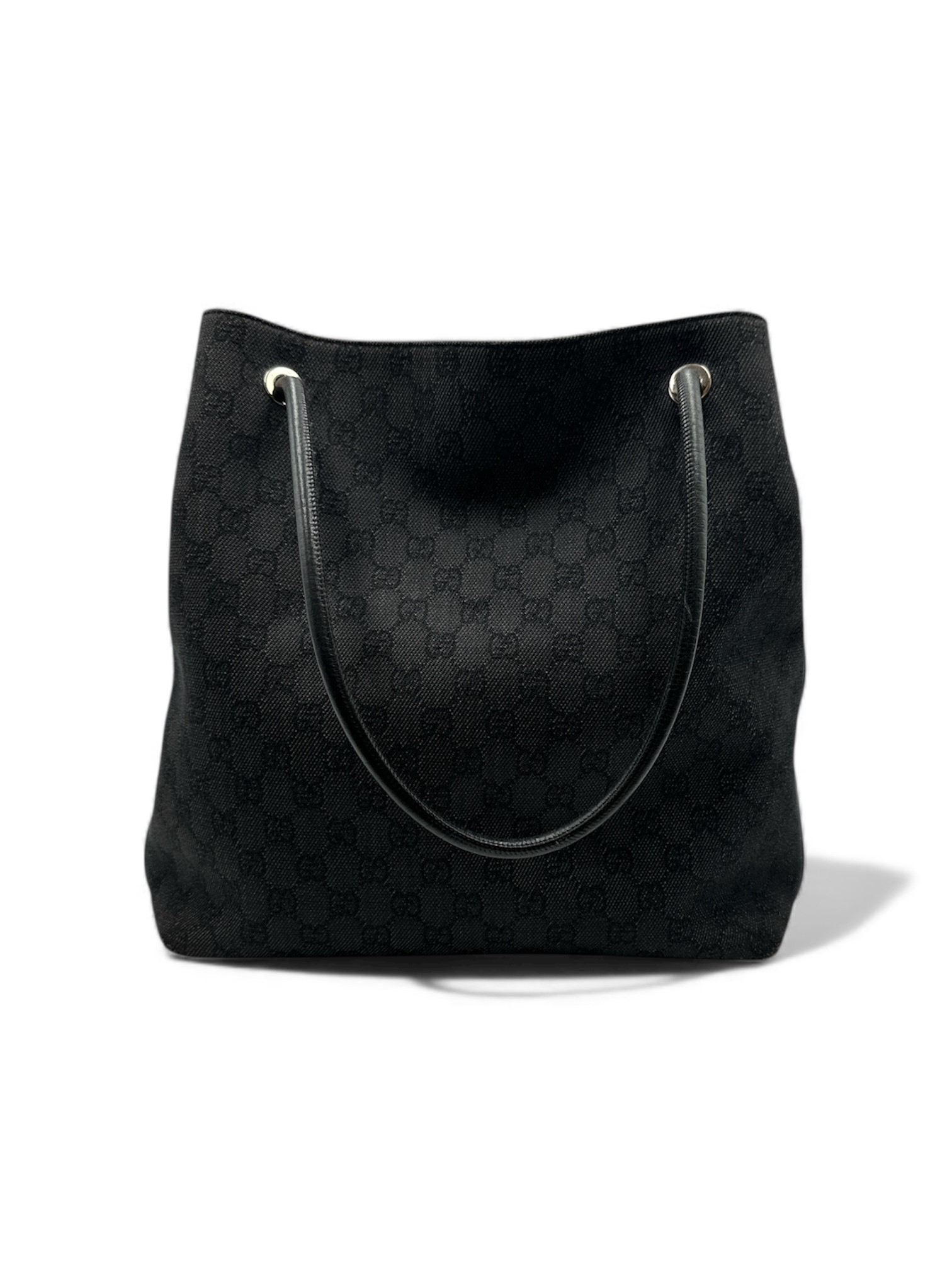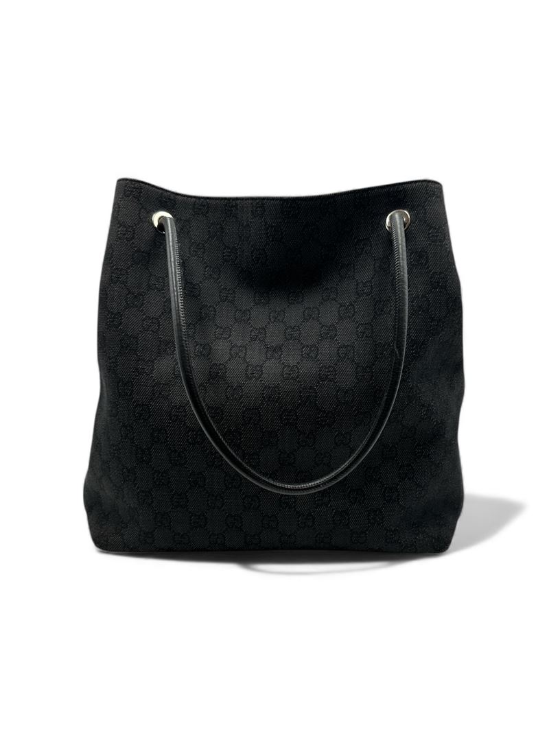 GUCCI Shopper in tela monogram nera e finiture in pelle. Cm 30x30x10. Reca marchio Gucci, Made in Italy e numero di serie. (lievi difetti)